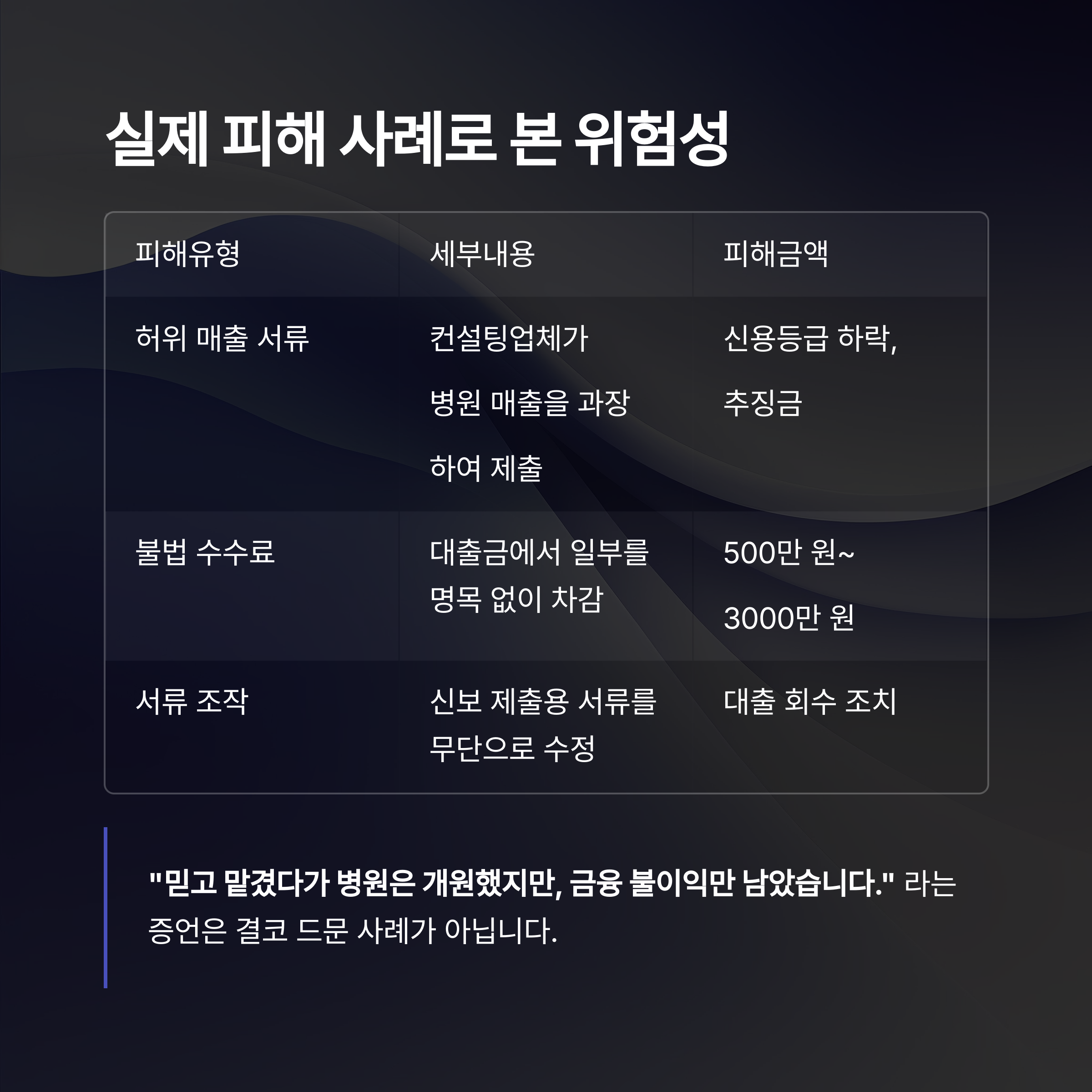 | 허위 매출 서류 | 컨설팅업체가 병원 매출을 과장하여 제출 | 신용등급 하락, 추징금 |