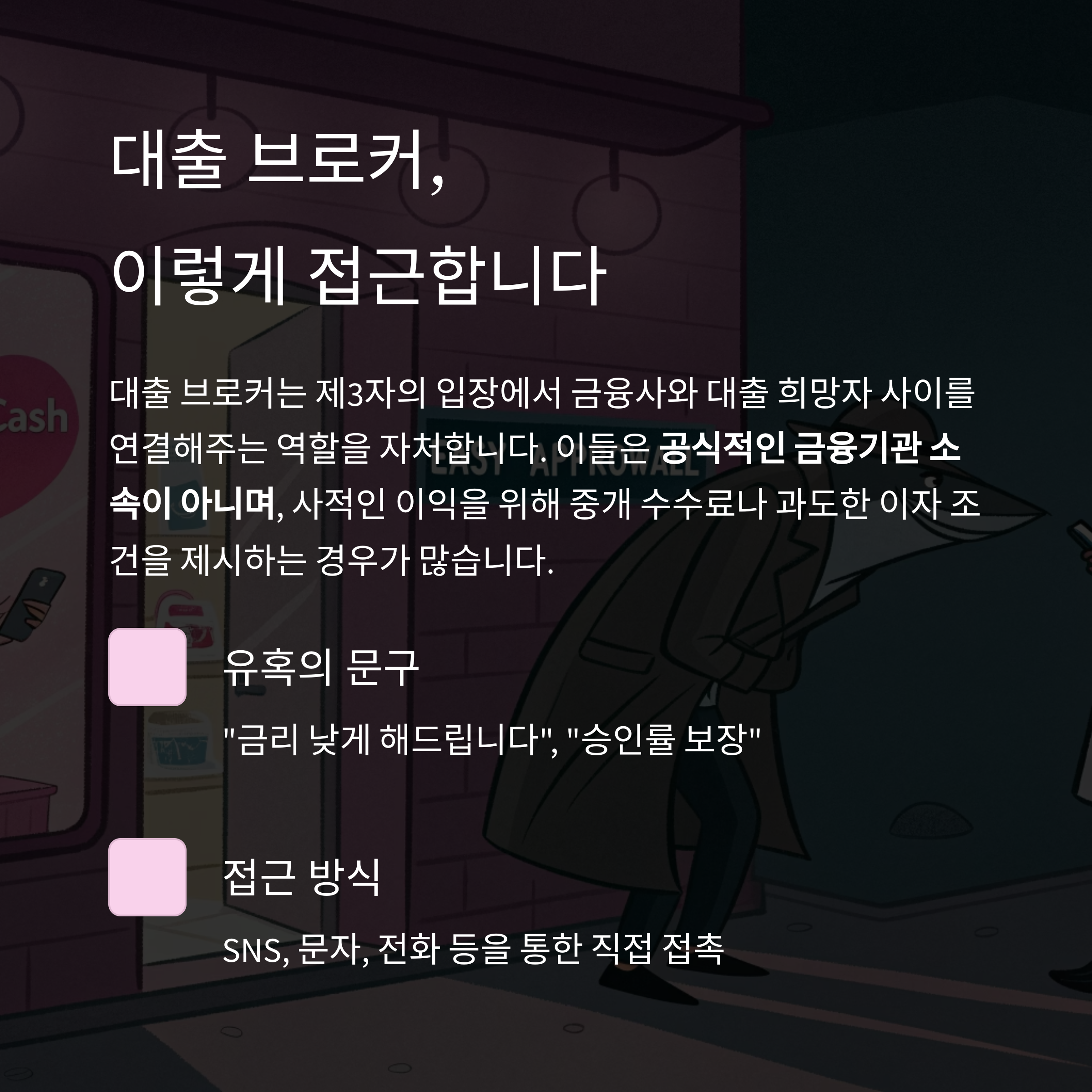 하지만 이들은 공식적인 금융기관 소속이 아니며, 사적인 이익을 위해 중개 수수료나 과도한 이자 조건을 제시하는 경우가 많습니다.