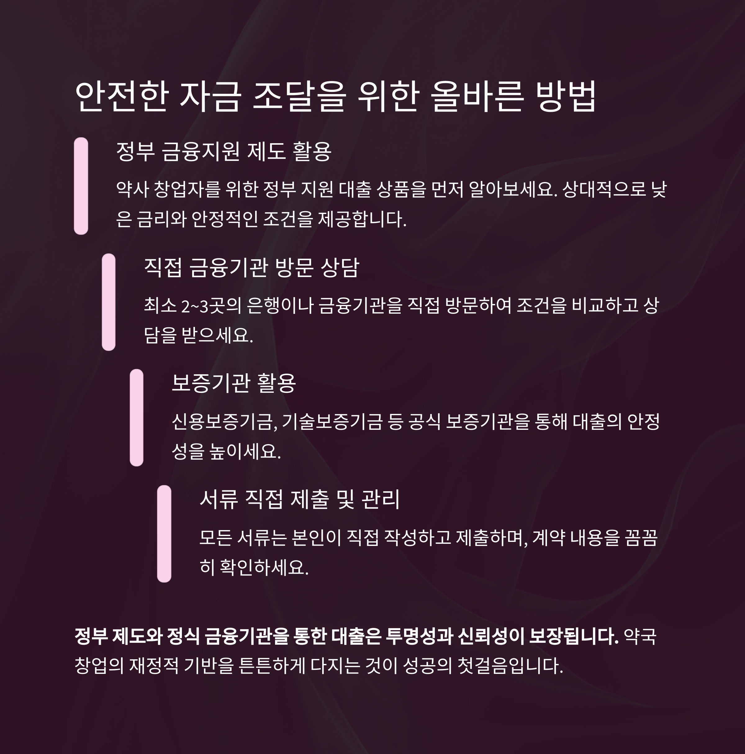 약국 개원을 위한 대출은 정부 금융지원 제도나 신용보증기금, 기술보증기금 등 공식 채널을 활용해야 합니다.