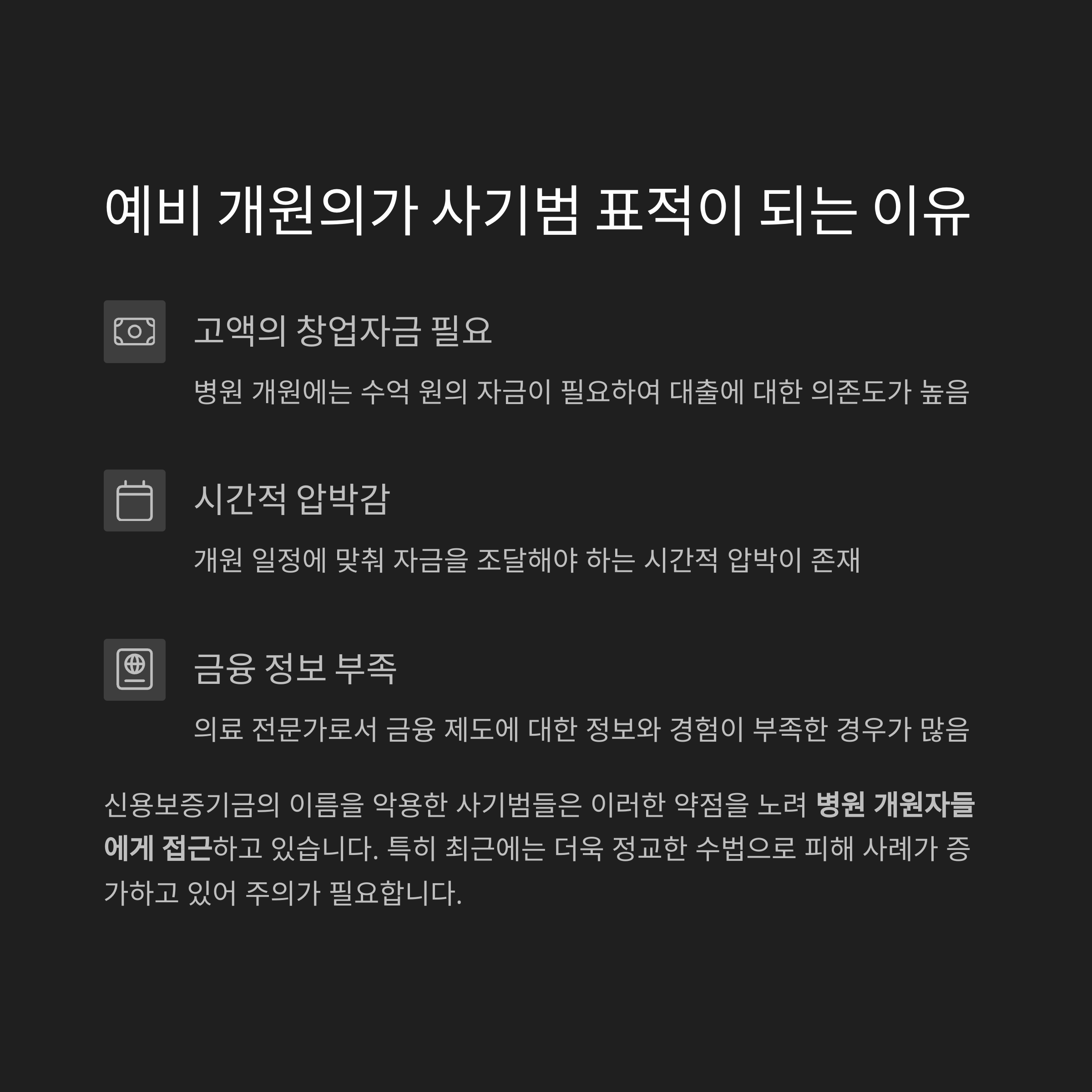 신용보증기금 보증을 내세운 대출사기, 왜 병원 개원자들이 표적이 될까요?