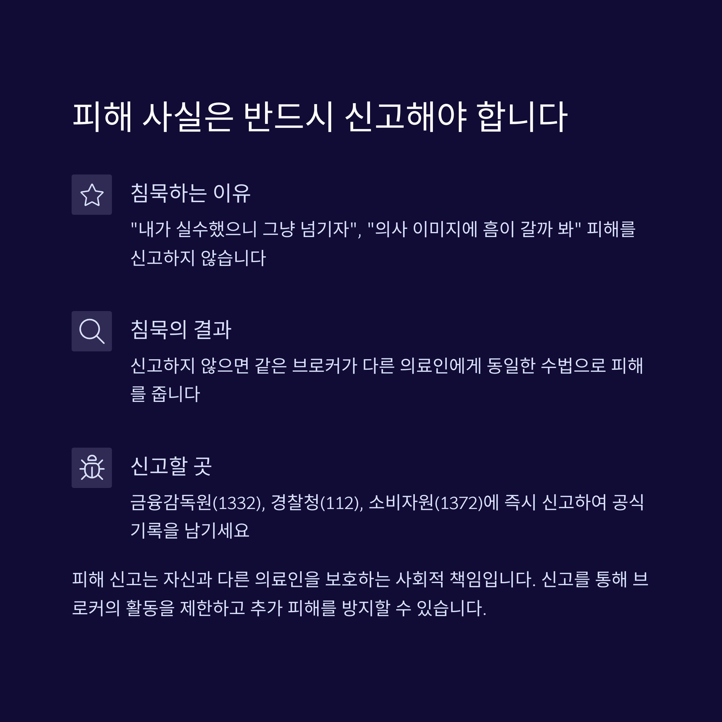 그러나 이는 브로커에게 또 다른 피해자를 양산하게 하는 침묵의 공범이 될 수 있습니다.