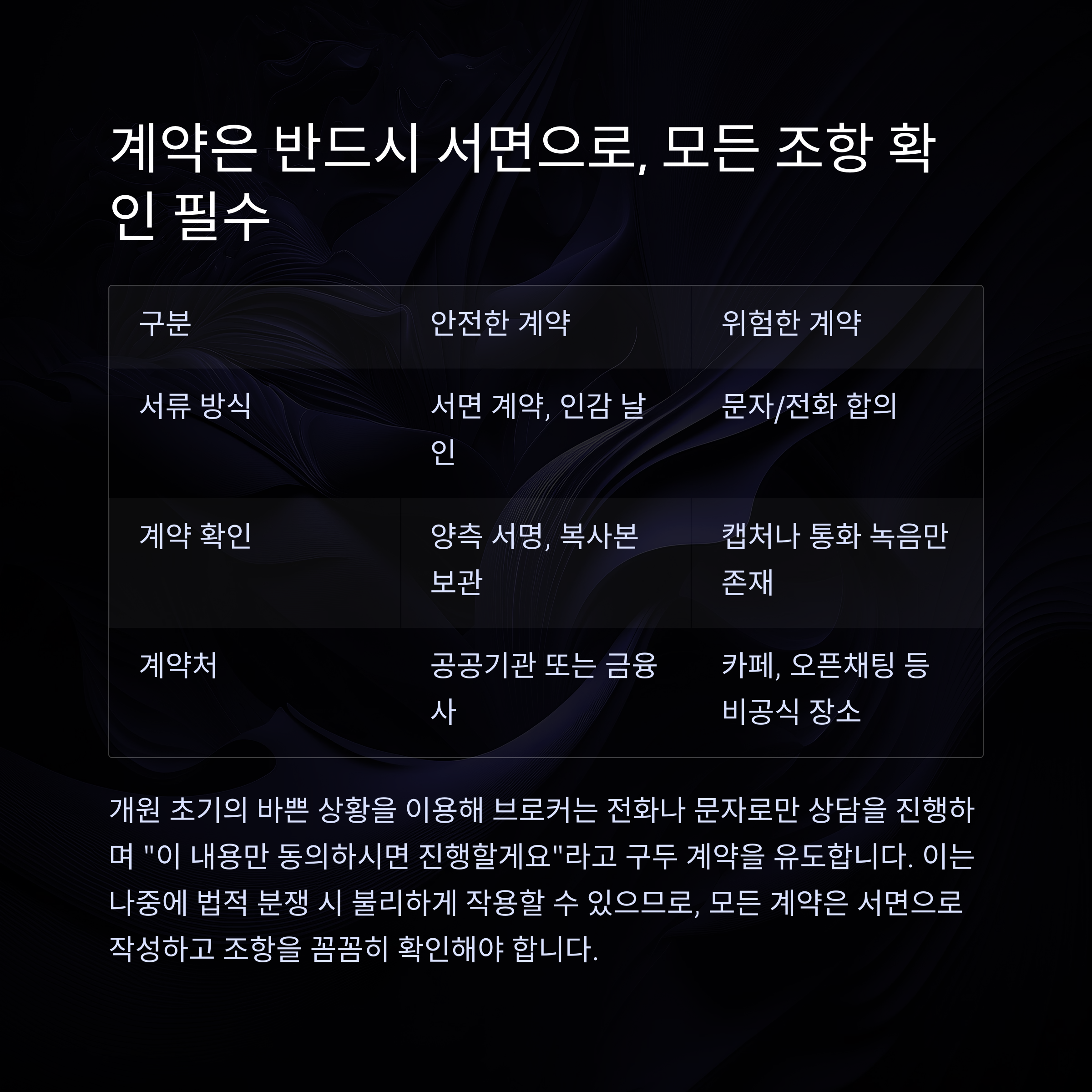 | 비공식 계약 | 법적 효력 없음 | 서면 계약, 서류 확인 필수 |