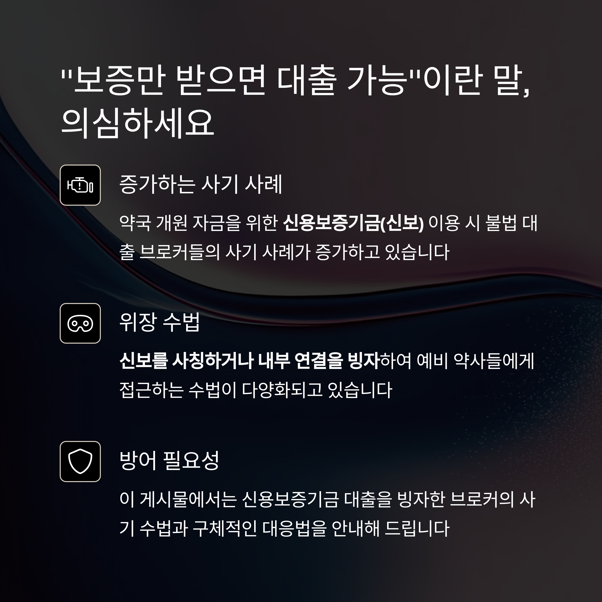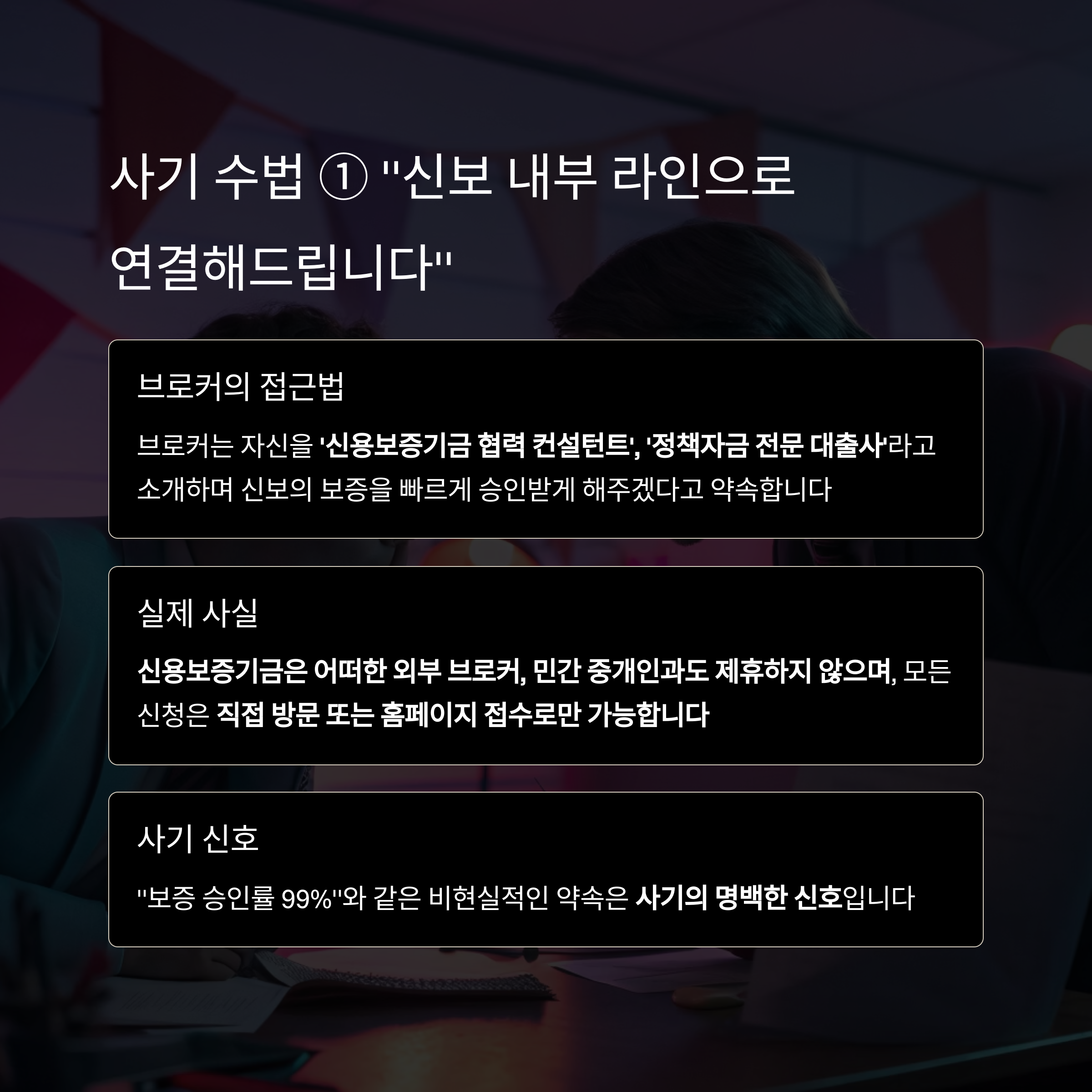 하지만 이를 노린 불법 대출 브로커들이 신보를 사칭하거나 내부 연결을 빙자해 사기를 저지르는 일이 늘고 있습니다.