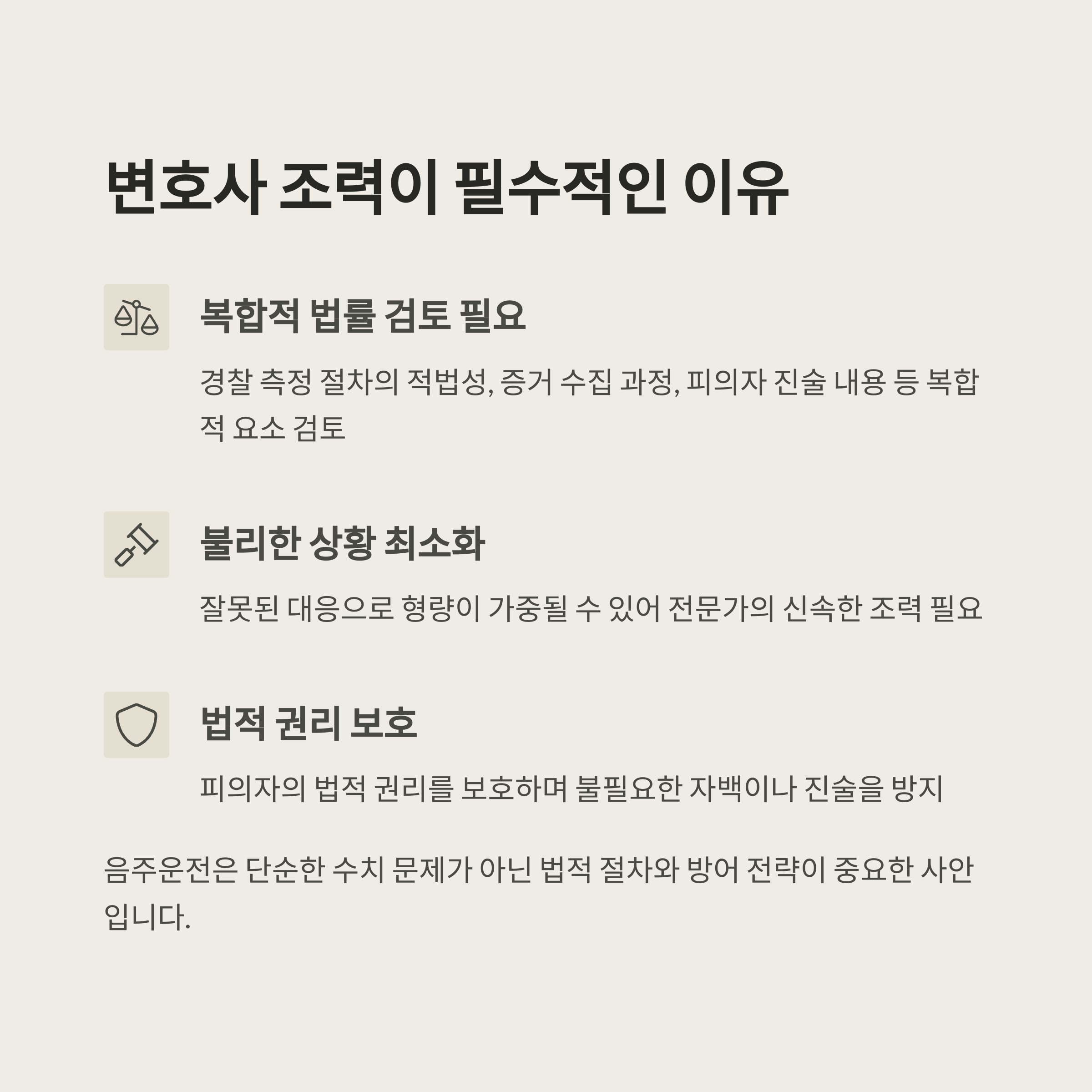 음주운전 적발은 단순한 수치 문제가 아닙니다. 경찰 측정 절차의 적법성, 증거 수집 과정, 피의자의 진술 내용 등 복합적 요소가 얽혀 있어 초기부터 변호사의 개입이 필수적입니다. 잘못된 대응은 형량을 높일 수 있으므로 전문가의 신속하고 정확한 조력이 필요합니다.