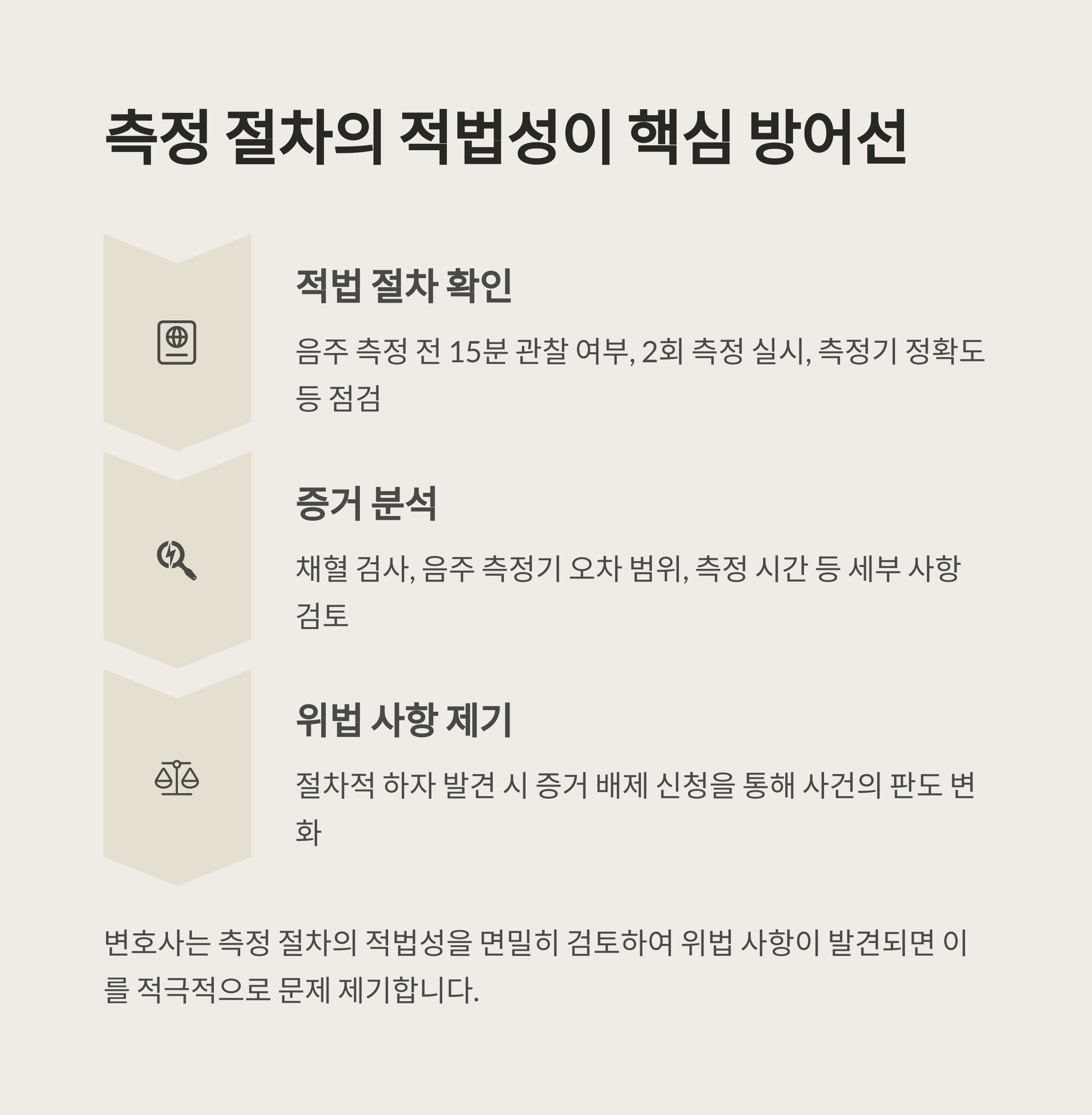 음주 측정 과정에서 경찰이 절차를 위반한 경우, 해당 증거는 법적 효력이 인정되지 않을 수 있습니다. 변호사는 측정 절차의 적법성을 면밀히 검토하고, 위법 사항이 발견되면 이를 적극적으로 문제 제기하여 사건의 판도를 바꿉니다.
