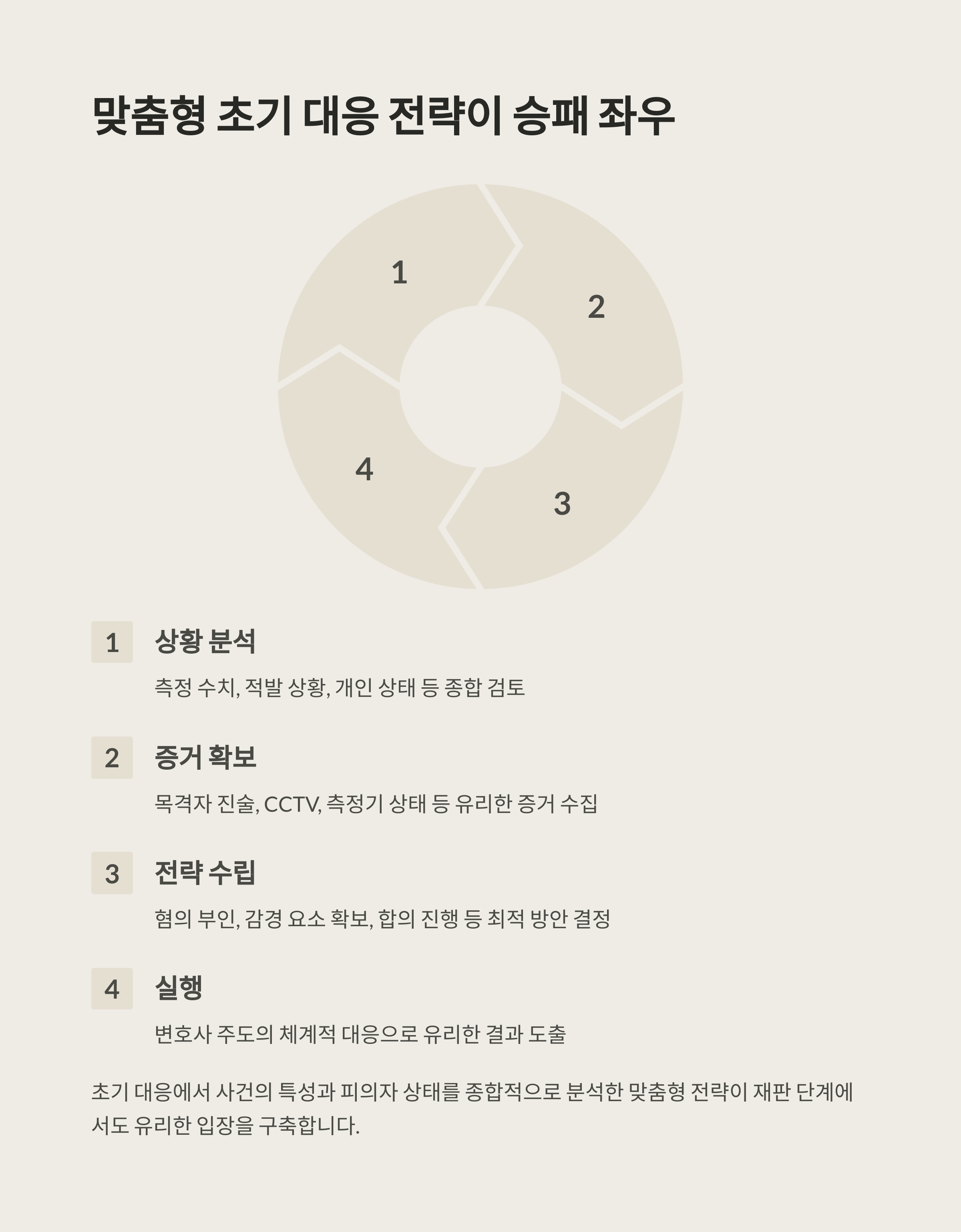 초기 대응에서 변호사가 사건의 특성, 측정 상황, 피의자 상태 등을 종합적으로 분석하고 사건별 맞춤형 전략을 세워야 합니다. 이를 통해 재판 단계에서도 유리한 입장을 구축할 수 있습니다.
