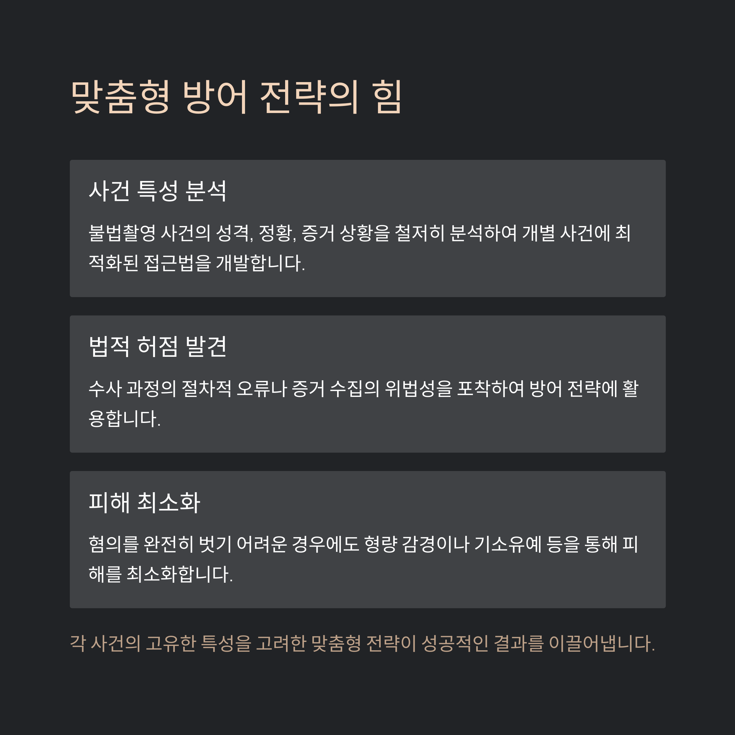 | 맞춤 대응 | 사건별 전략 수립, 방어권 보장 |