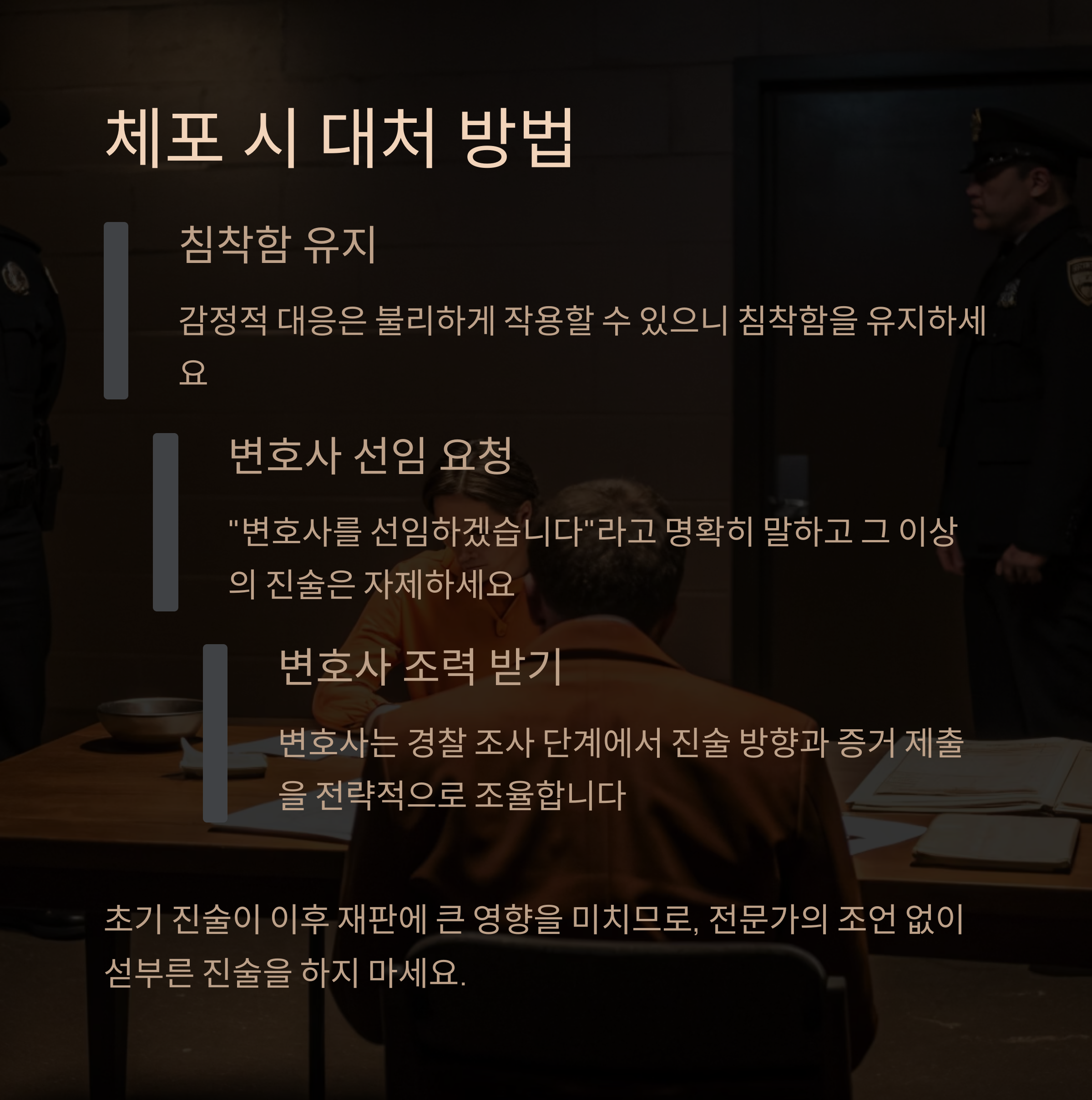 | 체포 및 조사 | 진술 조율, 불리한 진술 방지 |