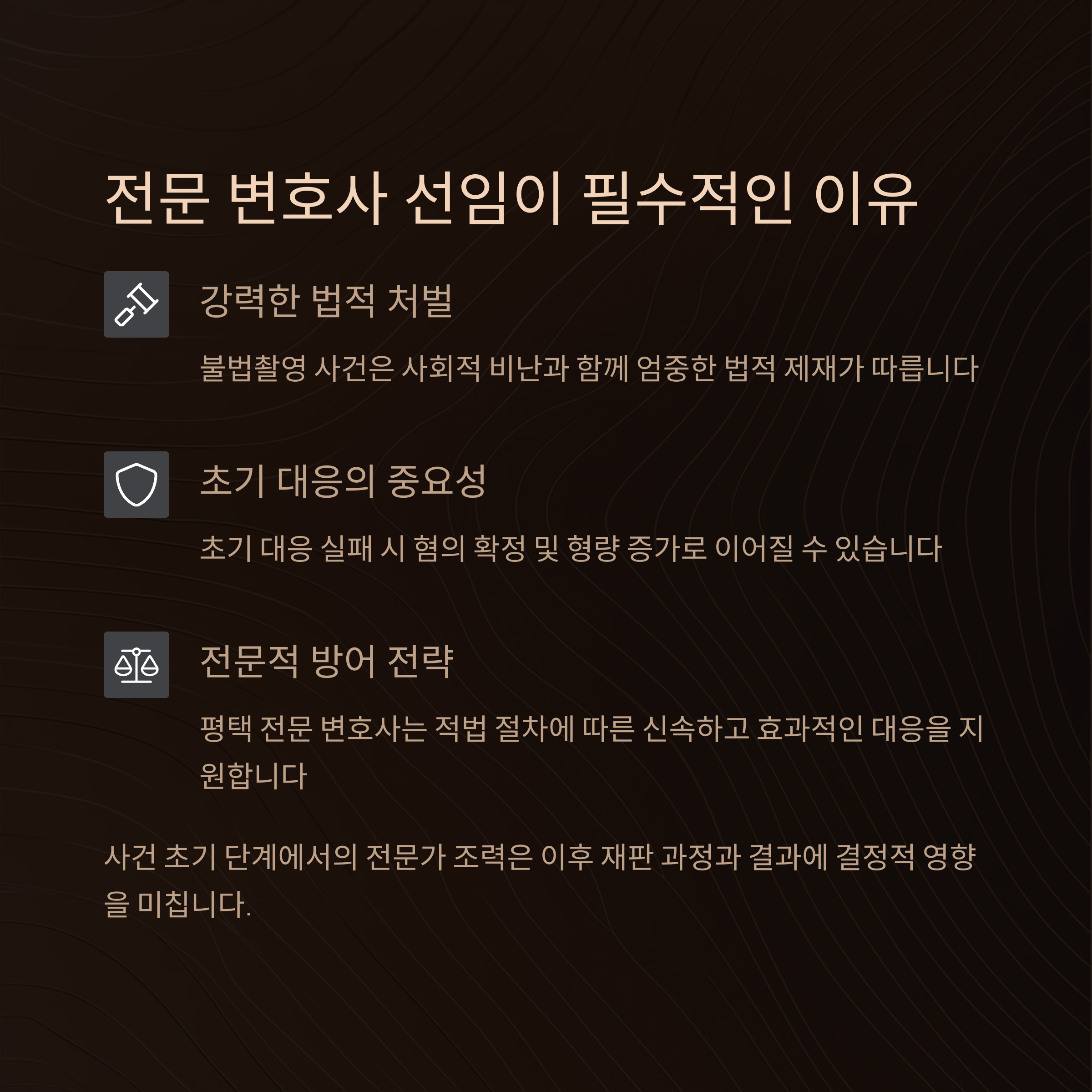 평택 지역에서 불법촬영 사건으로 법적 위기에 처했다면, 신속하고 전문적인 법률 조력이 핵심입니다. 변호사가 제공하는 초기 대응 전략과 전문적 조력 방안을 살펴봅니다.