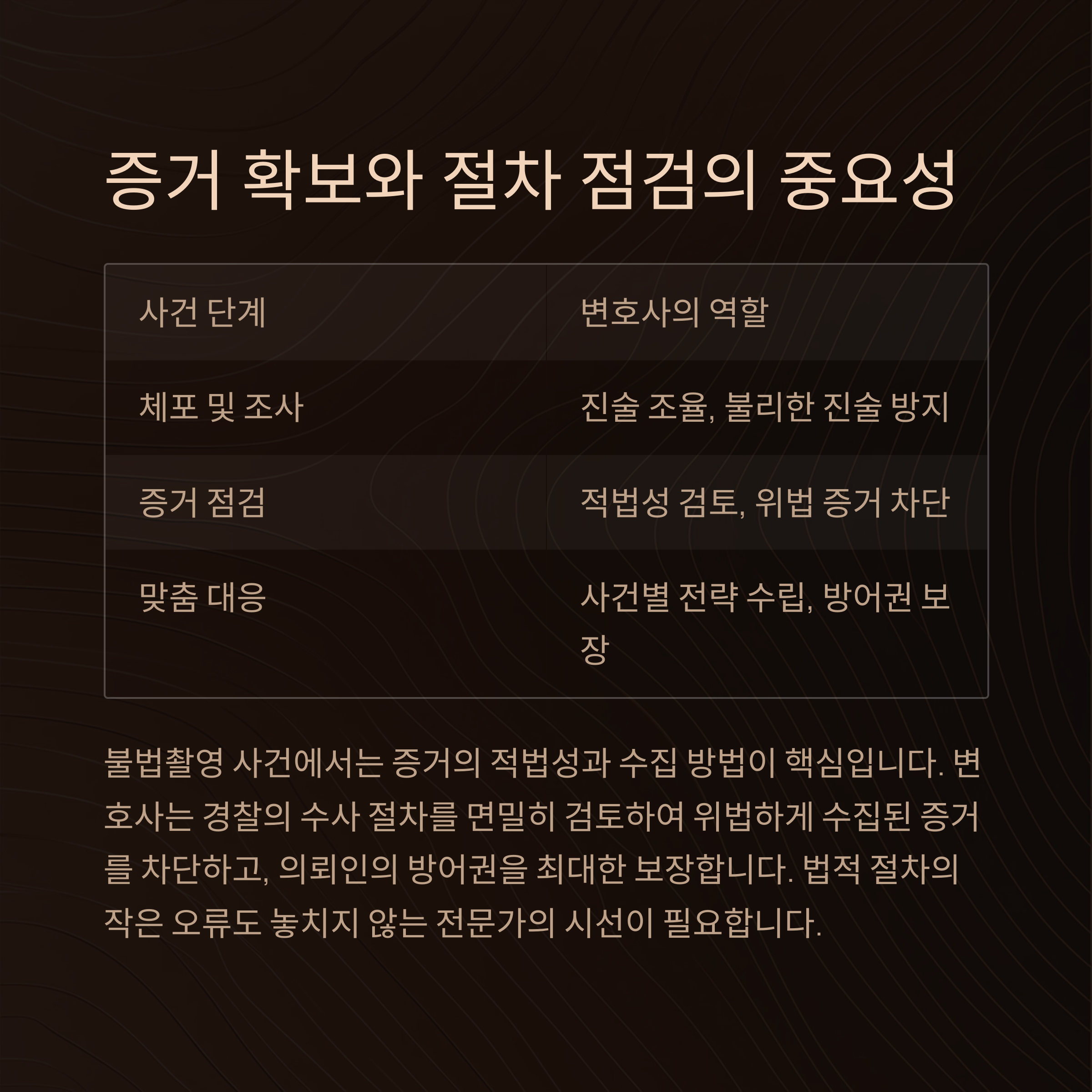 | 증거 점검 | 적법성 검토, 위법 증거 차단 |