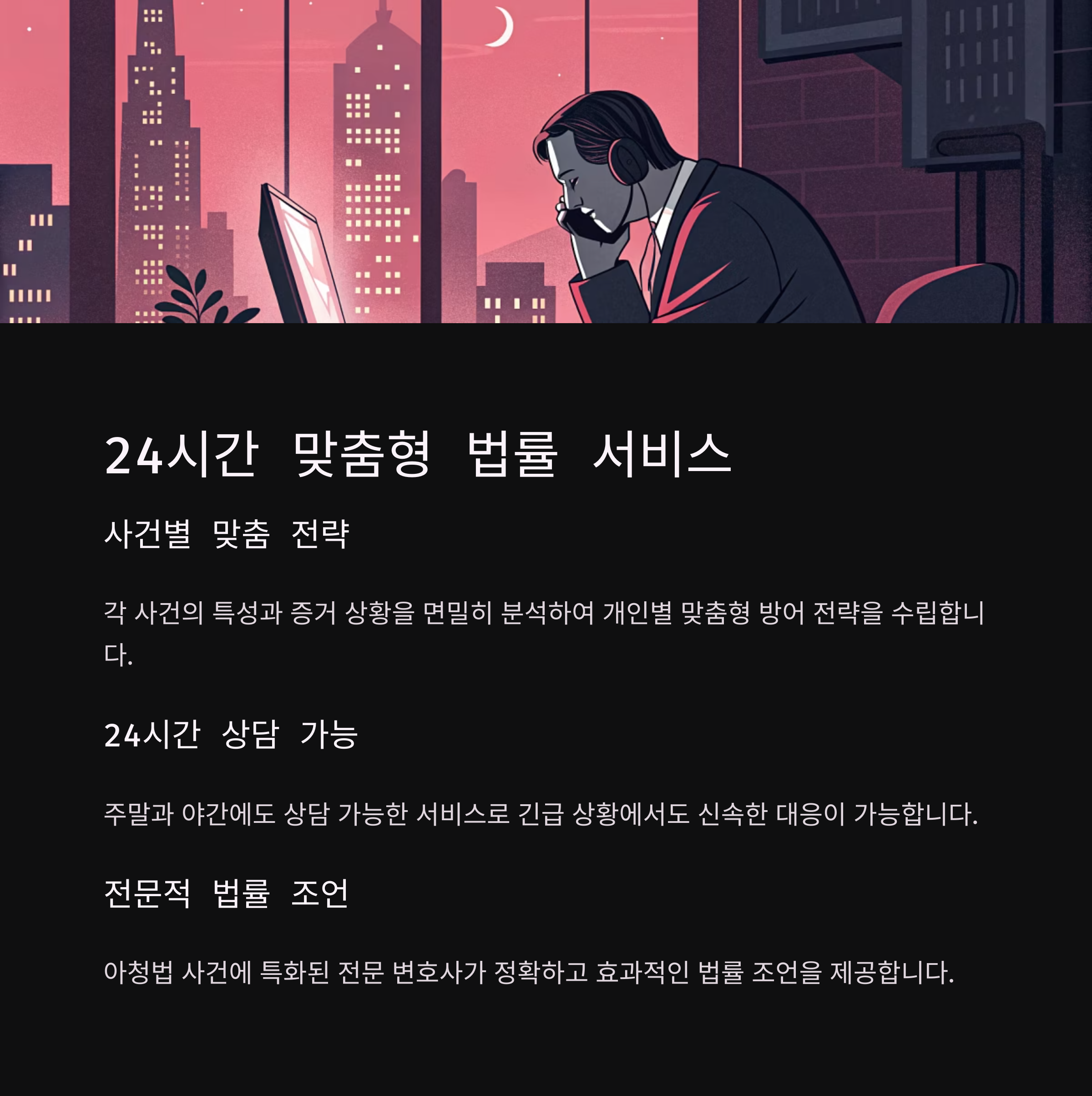 오산 아청법 전문 변호사는 사건의 특성과 증거 상황을 빠르게 분석하여 맞춤형 방어 전략을 세웁니다. 주말과 야간에도 상담 가능한 24시간 법률 서비스를 통해 긴급한 상황에도 신속 대응이 가능합니다.