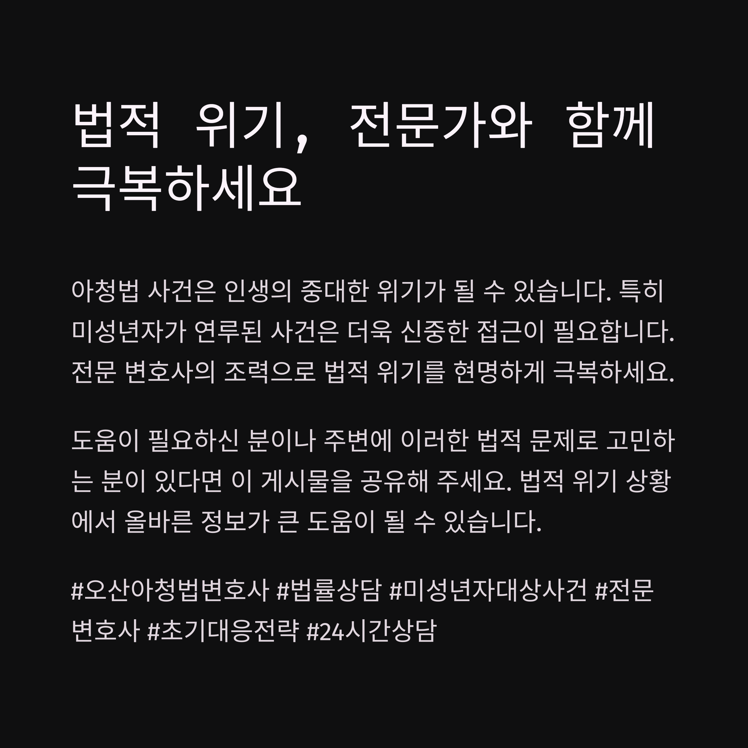 #오산아청법변호사 #법률상담 #미성년자대상사건 #전문변호사 #초기대응전략 #24시간상담