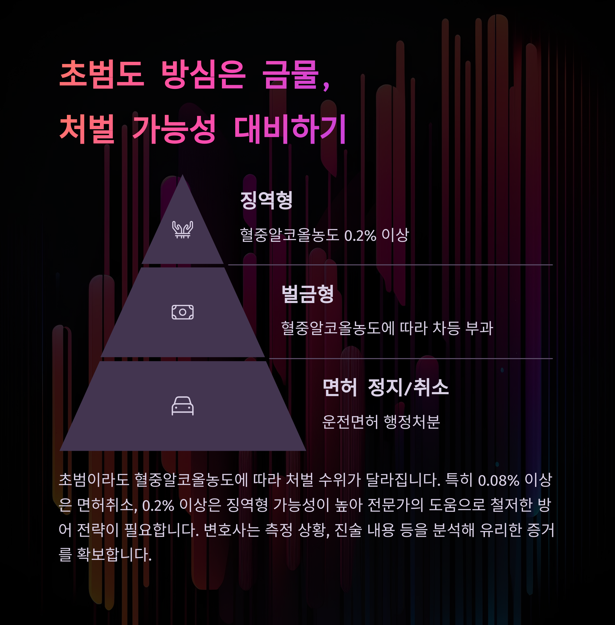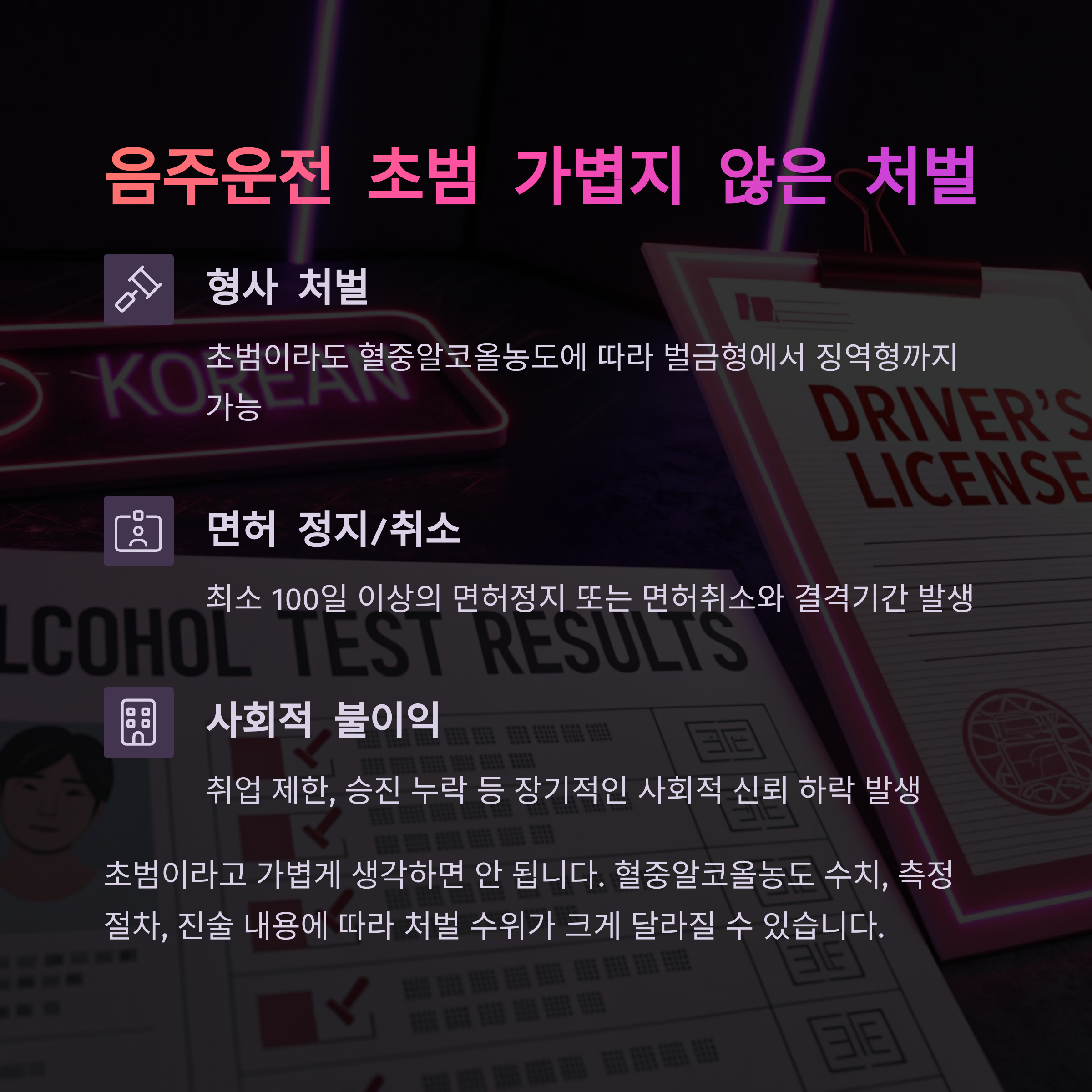 음주운전은 초범이라도 형사 처벌, 면허 정지, 사회적 신뢰 하락 등 다양한 불이익이 따릅니다. 특히 혈중알코올농도 수치, 측정 절차, 진술 내용에 따라 처벌 수위가 결정됩니다. 초범이라도 변호사의 법률 상담과 전략적 대응이 필요합니다.