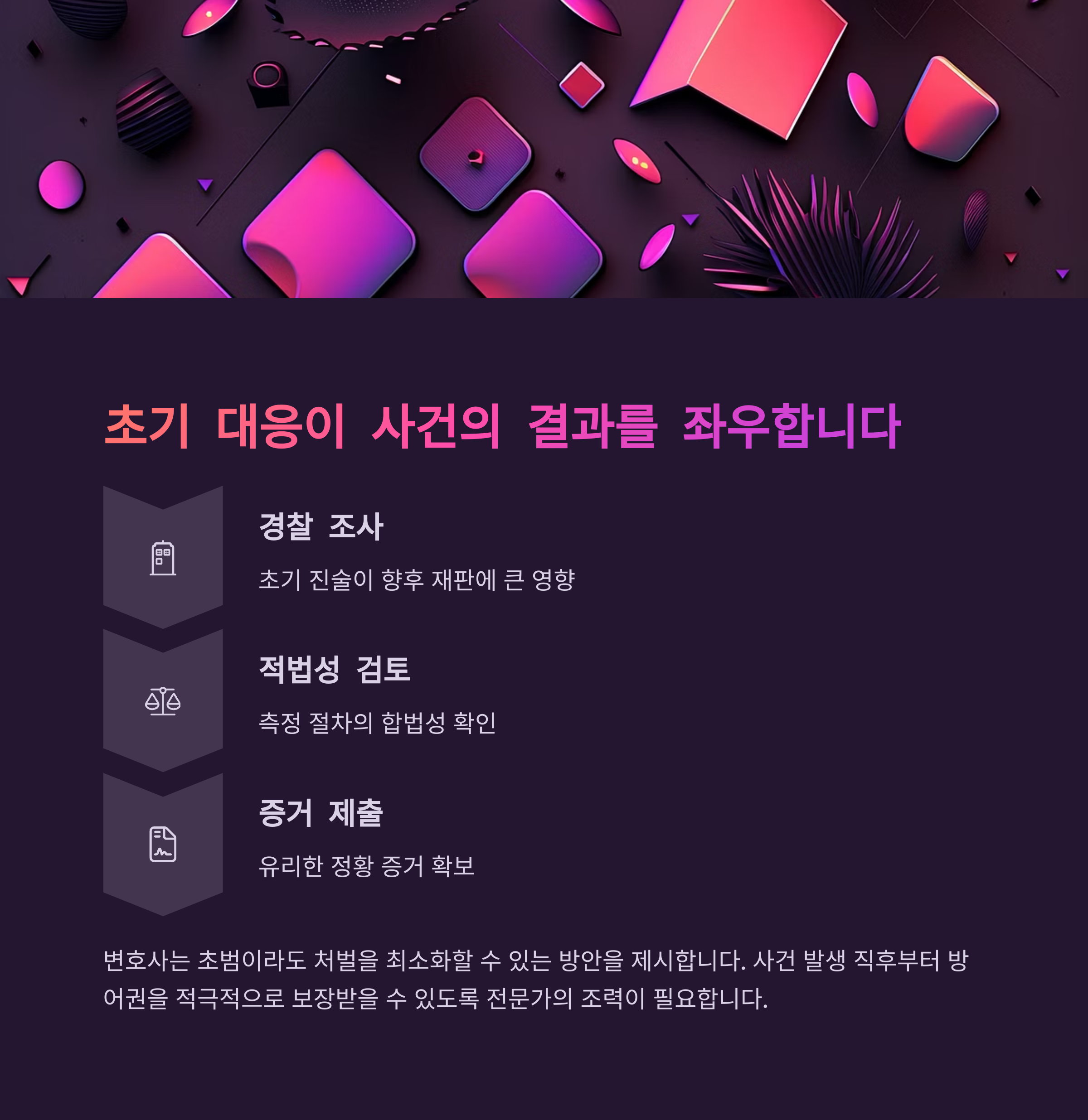 초기 단계에서는 경찰 조사 진술, 측정 절차의 적법성, 증거 제출 여부 등 구체적 대응이 필요합니다. 변호사는 초범이라도 처벌을 줄일 수 있는 방안을 제시하며, 사건 초기부터 방어권을 적극 보장합니다.
