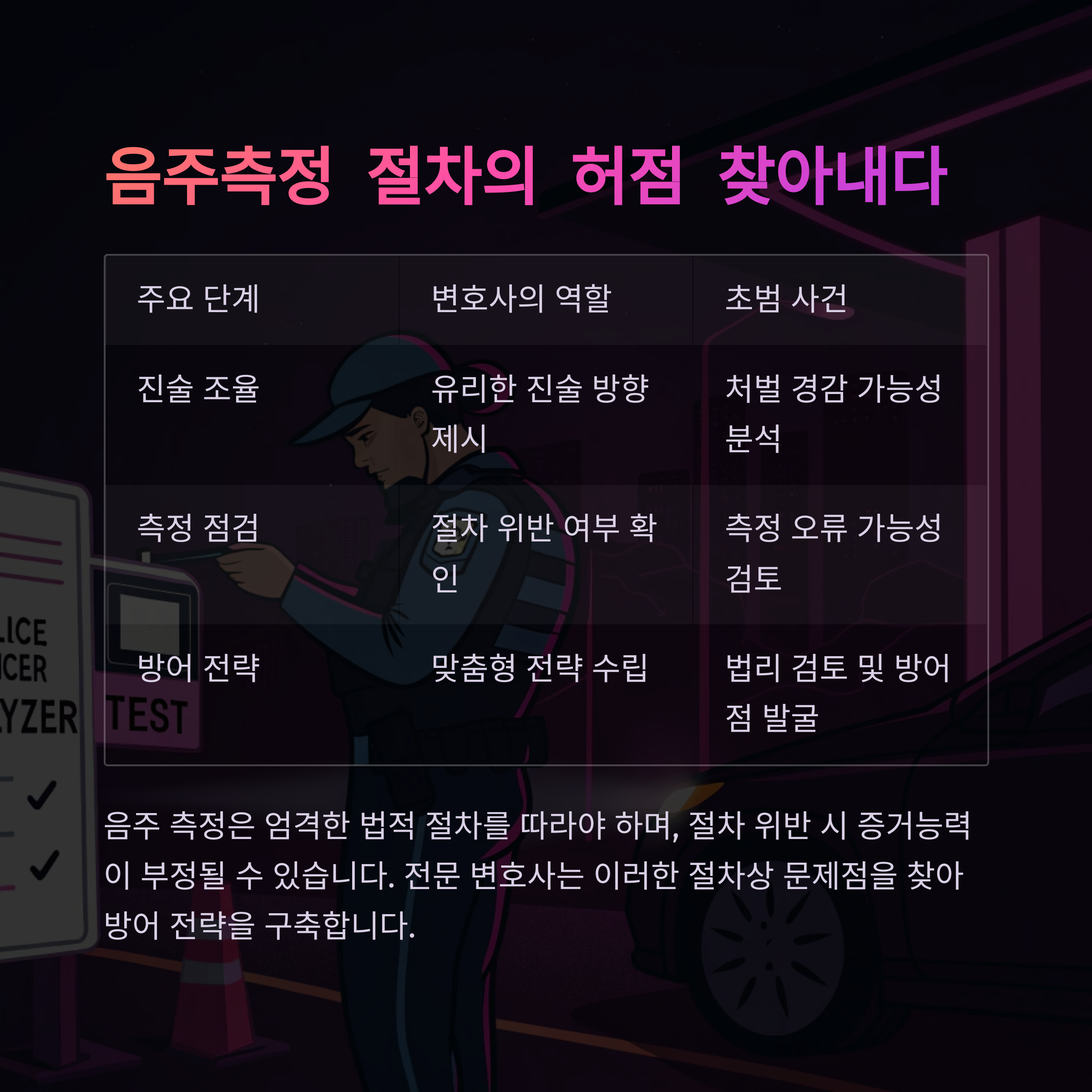 경찰의 음주 측정은 법적 절차를 철저히 따라야 하며, 절차 위반 시 증거 능력이 부정될 수 있습니다. 변호사는 측정 절차의 문제점을 점검하고, 이를 근거로 방어 전략을 세웁니다.