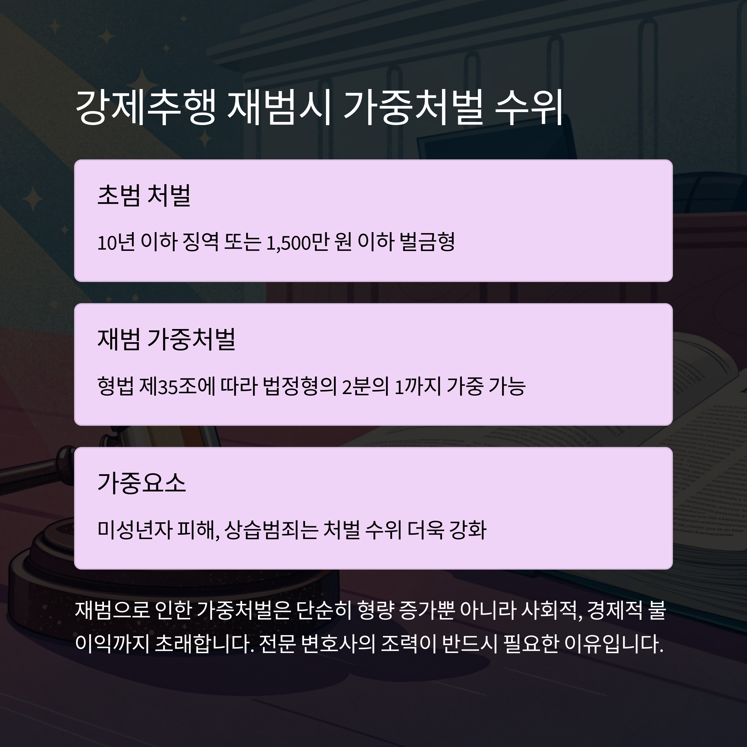 강제추행 재범은 초범과 달리 형량과 처벌 수위가 크게 강화됩니다. 용인에서 강제추행 재범 사건으로 법적 위기에 처했다면, 전문 변호사의 조력이 반드시 필요합니다.
