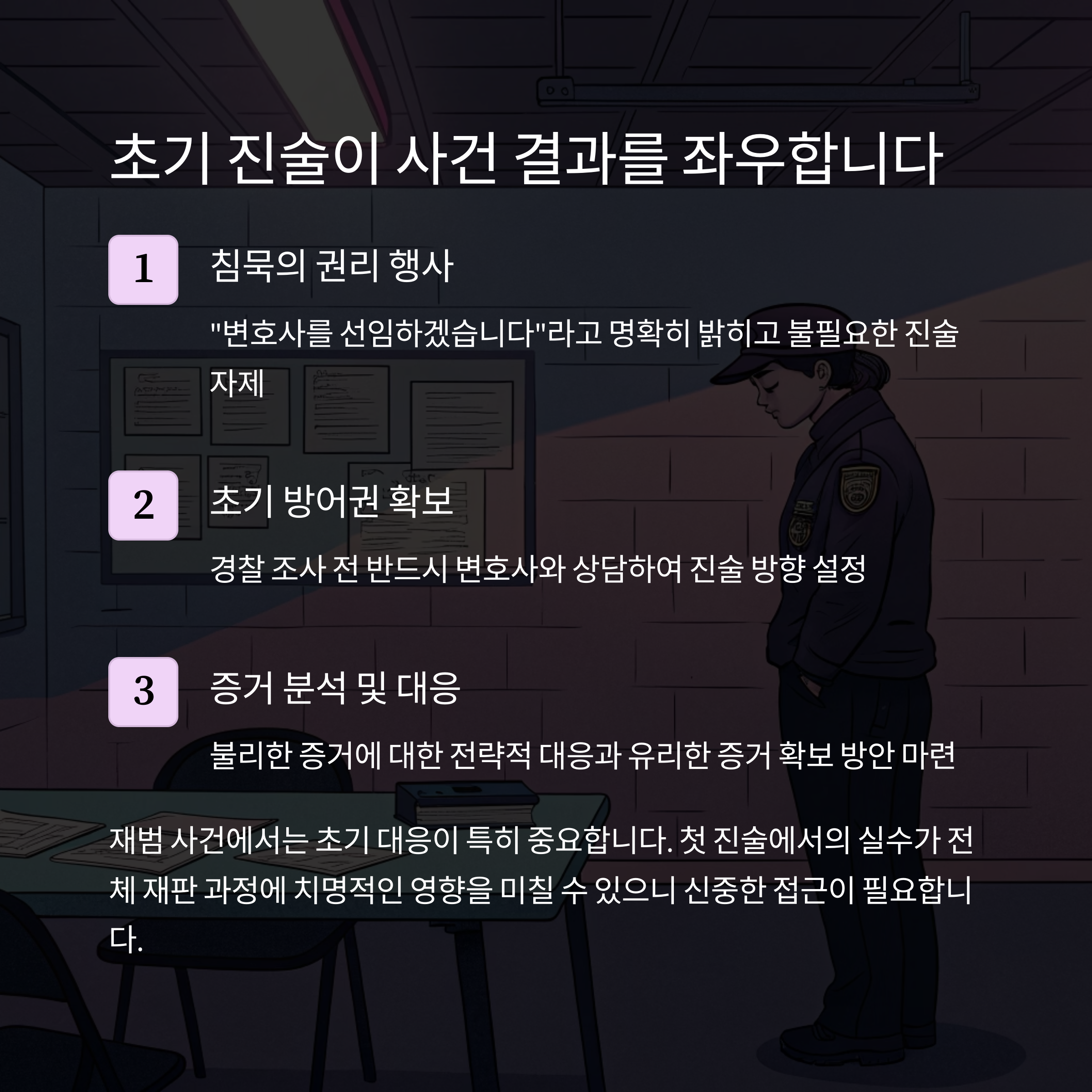 재범 사건은 경찰 조사나 초기 진술에서 불리한 내용을 피하고, "변호사를 선임하겠습니다"라고 밝히며 진술을 신중히 해야 합니다. 변호사는 사건 초기부터 방어권을 확보하고, 불리한 증거를 분석하여 대응 전략을 마련합니다.