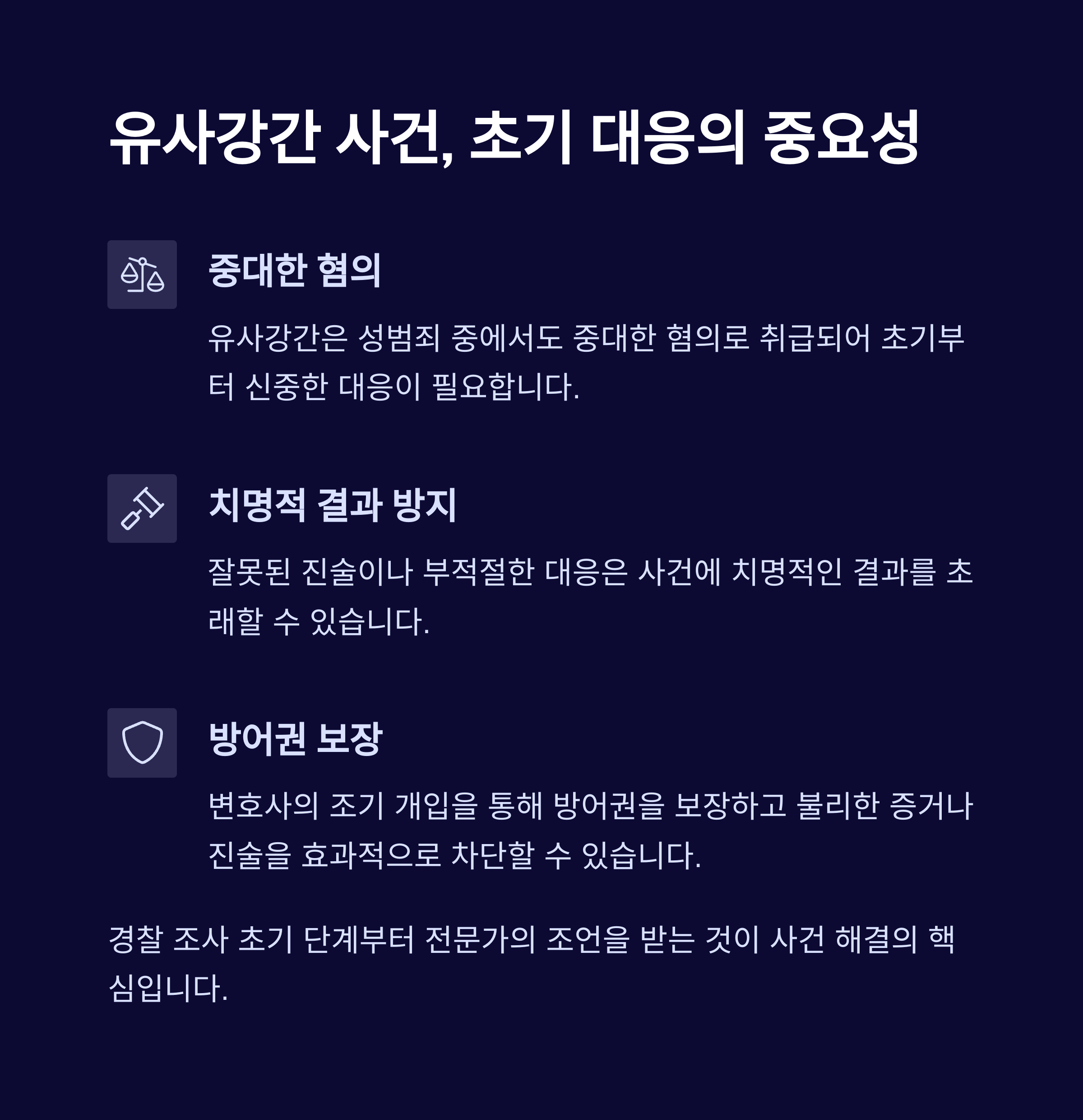 유사강간은 성범죄 중에서도 중대한 혐의로, 경찰 조사 초기부터 잘못된 진술이나 부적절한 대응이 치명적인 결과를 초래할 수 있습니다. 변호사의 개입을 통해 방어권을 보장하고 불리한 증거나 진술을 차단해야 합니다.