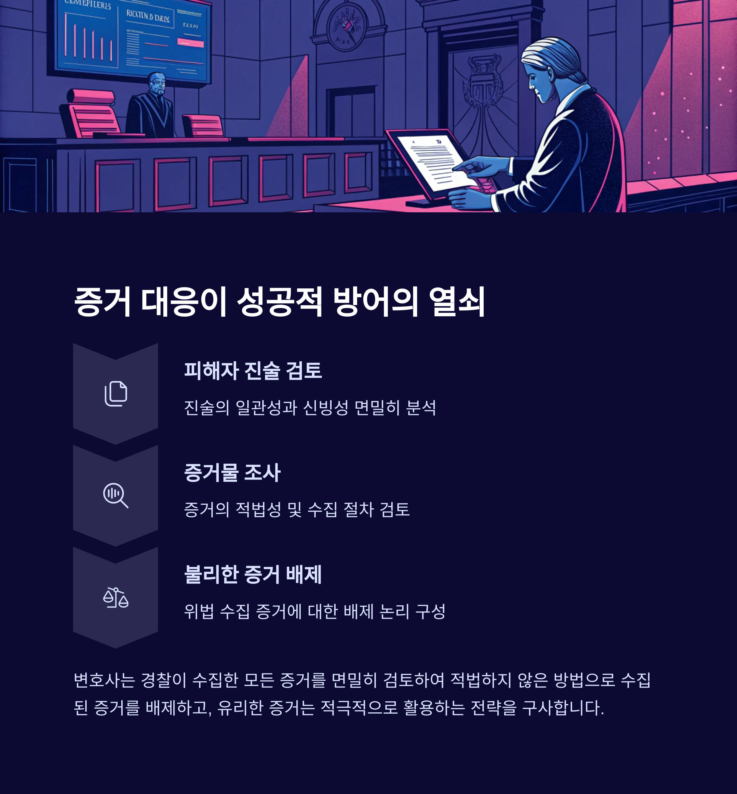 경찰 수사에서는 피해자 진술, 증거물, 진술 일관성 등 다양한 요소가 중대한 역할을 합니다. 변호사는 증거의 적법성, 수집 절차를 면밀히 검토하고 위법하거나 불리한 증거를 배제하기 위한 논리를 세웁니다.