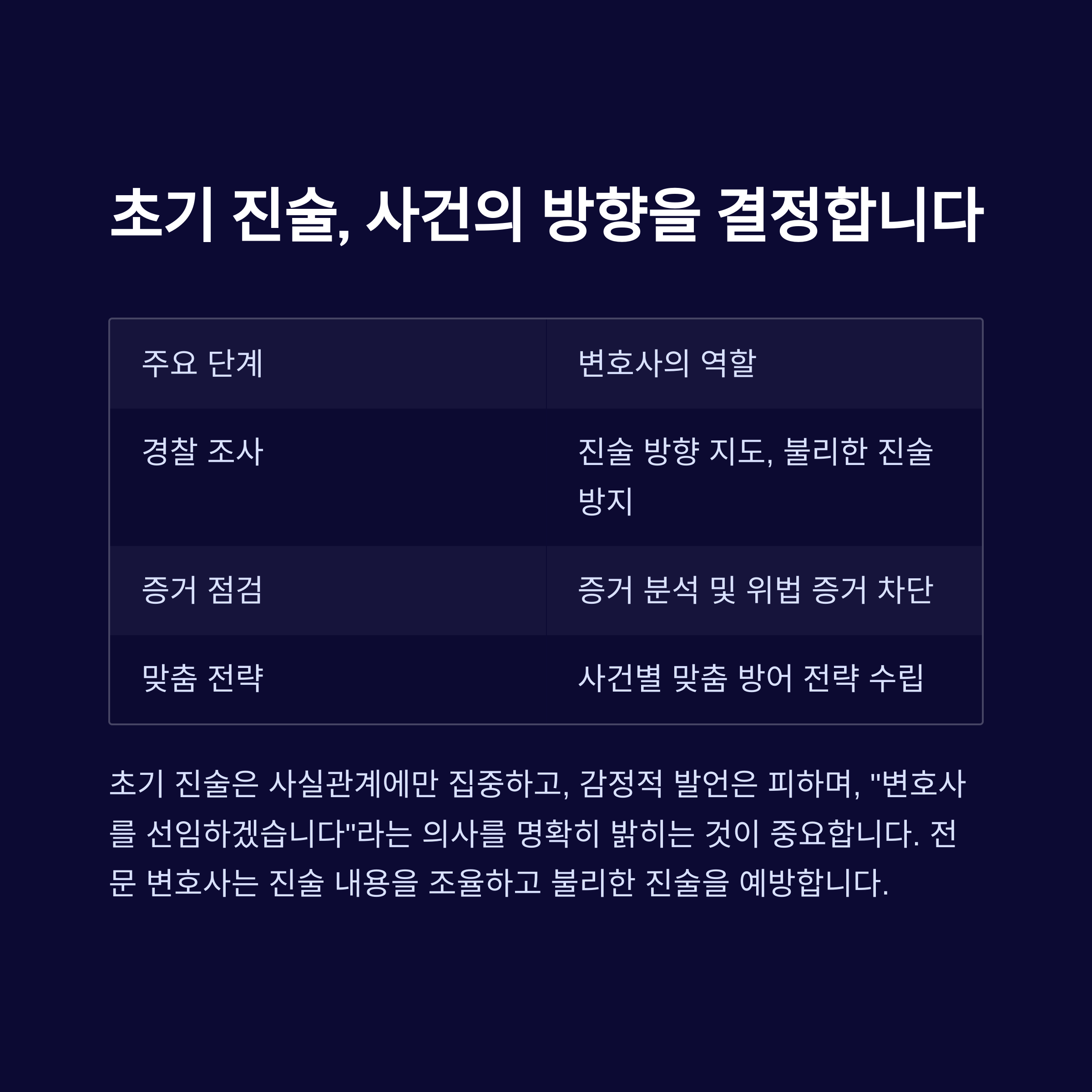 초기 진술은 사건의 진행 방향을 결정할 만큼 중요합니다. 진술은 단순한 사실관계에 집중하고, 감정적 발언은 피하며, "변호사를 선임하겠습니다"라는 의사를 명확히 밝혀야 합니다. 변호사는 진술 내용을 조율하고 불리한 진술을 예방합니다.