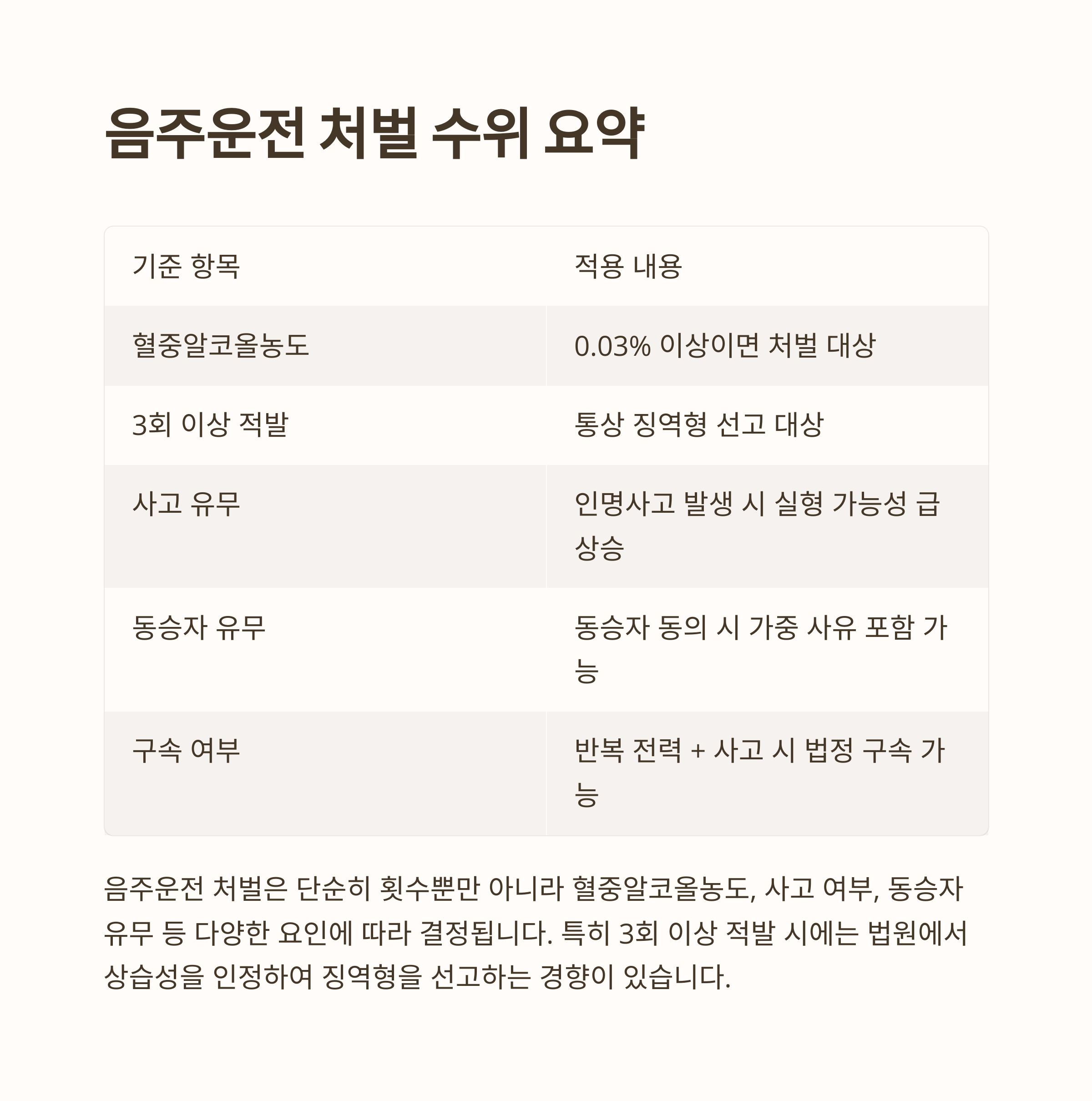 음주운전은 다음 기준에 따라 처벌 수위가 결정됩니다: