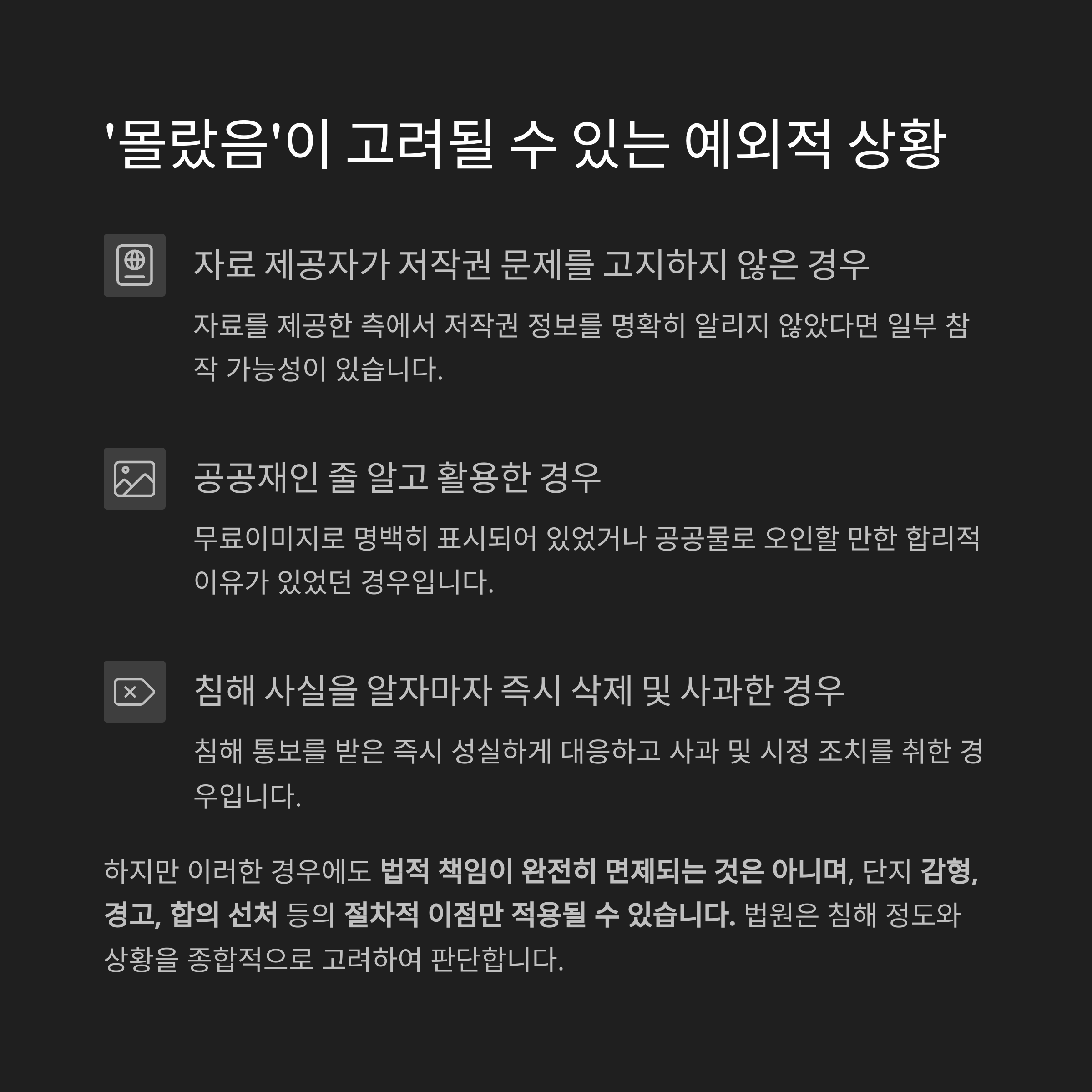 - 공공재인 줄 알고 활용한 경우 (예: 무료이미지로 오인)