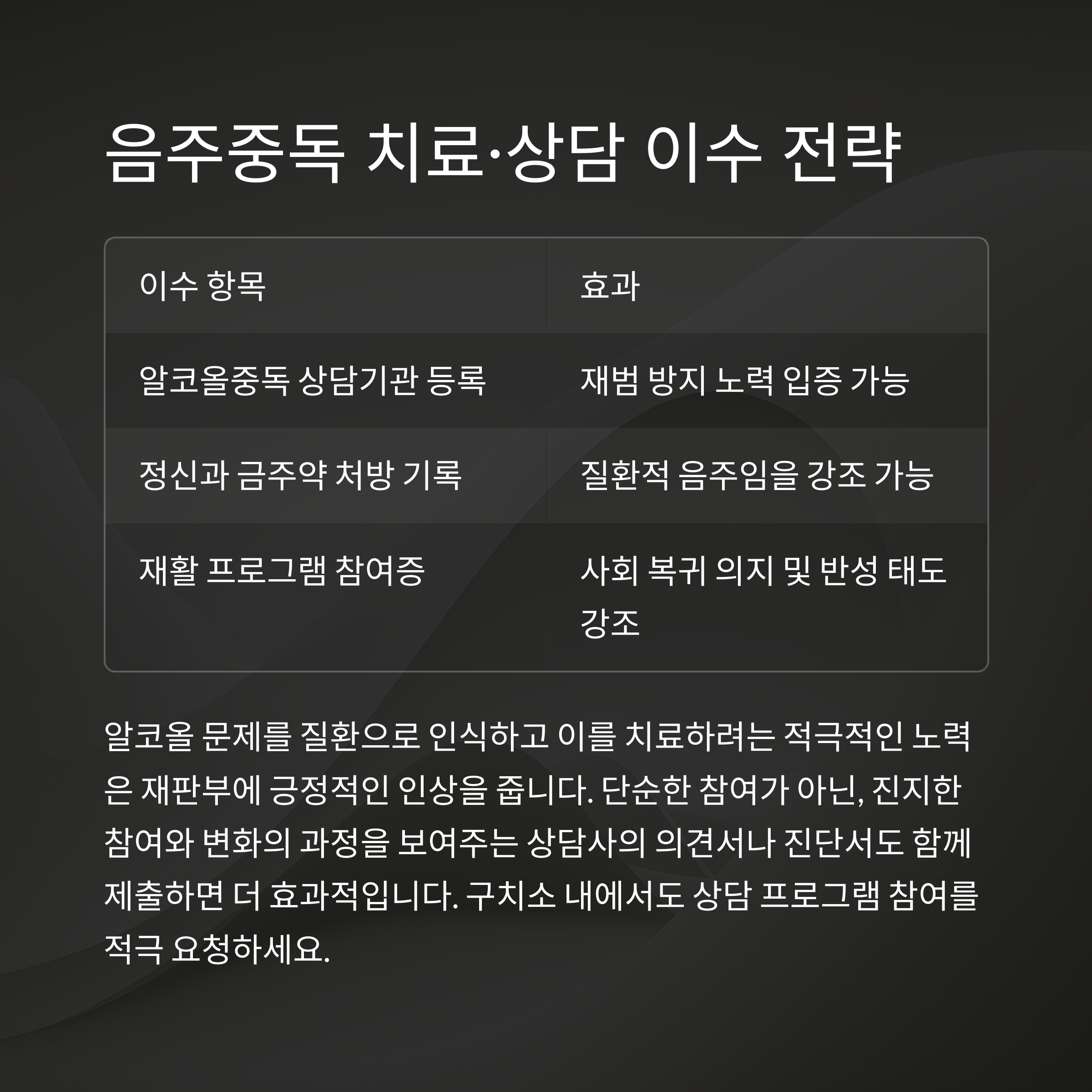 | 알코올중독 상담기관 등록 | 재범 방지 노력 입증 가능 |