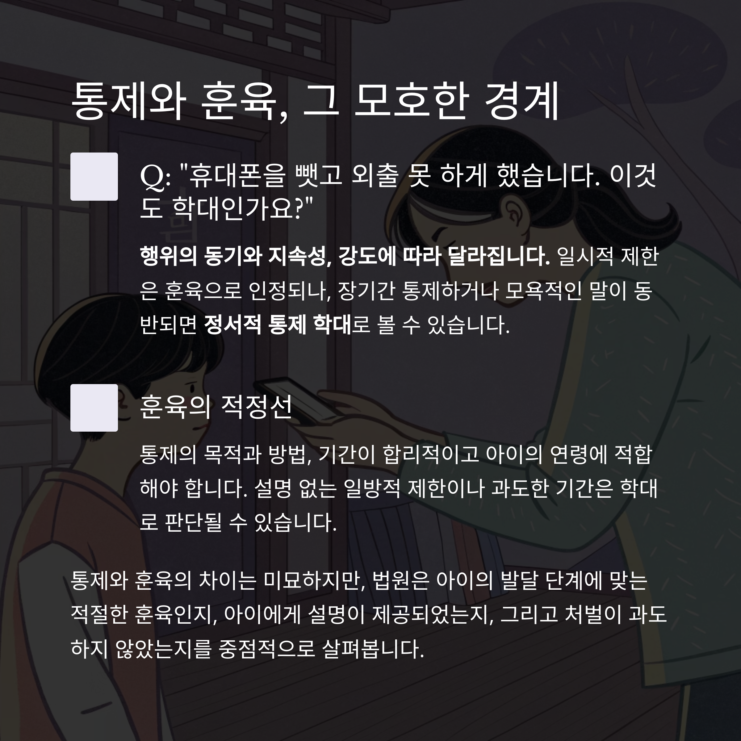 장기간 통제하거나 모욕적인 말이 동반되면 정서적 통제 학대로 볼 수 있습니다.