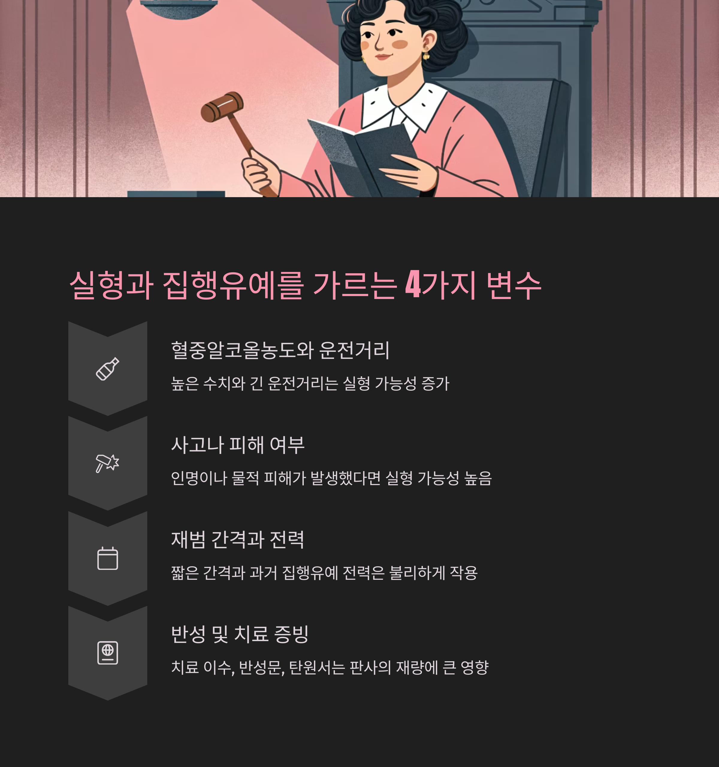 셋째, 음주운전 재범 간격이 짧고, 과거에 집행유예 전력이 있다면 실형 확률이 높습니다.