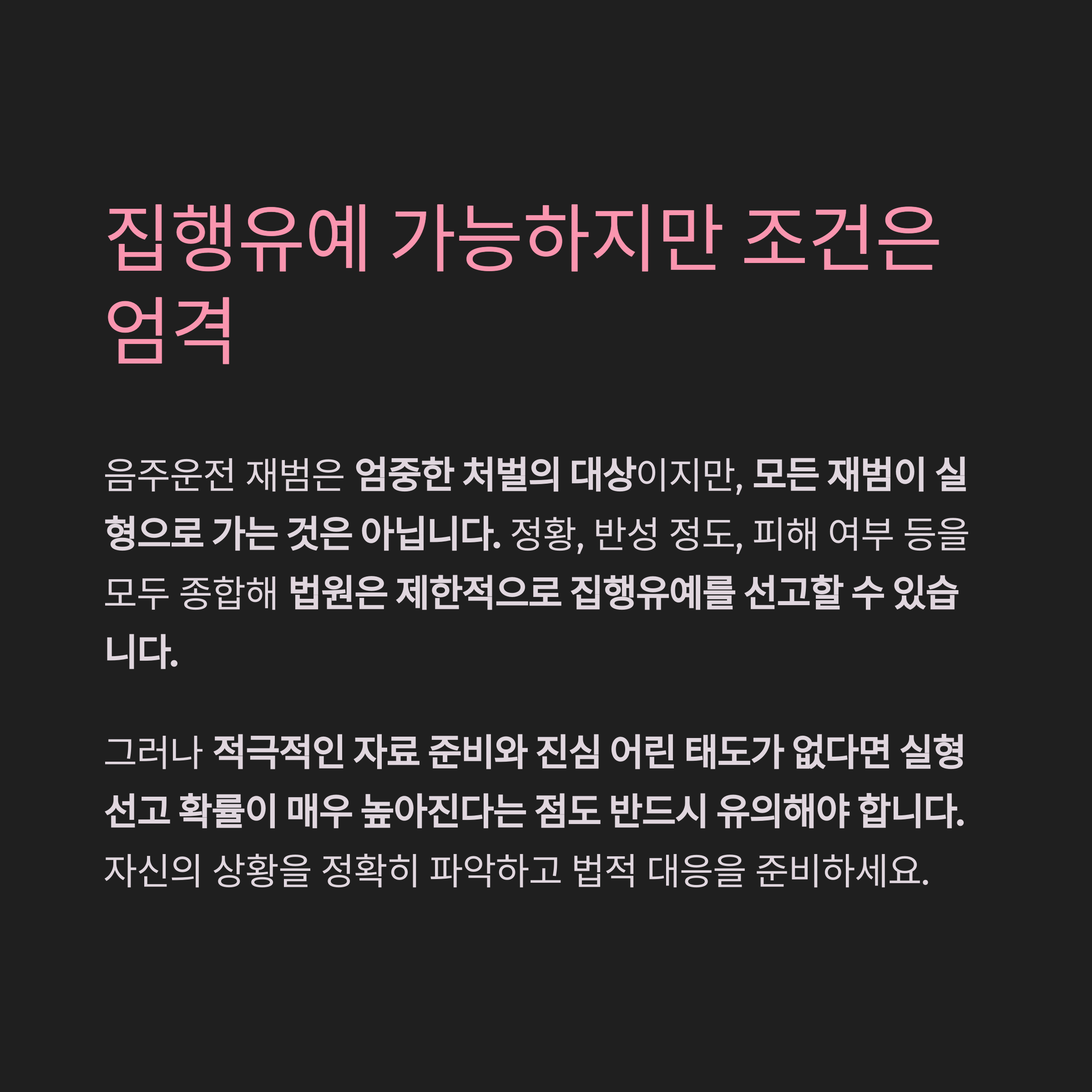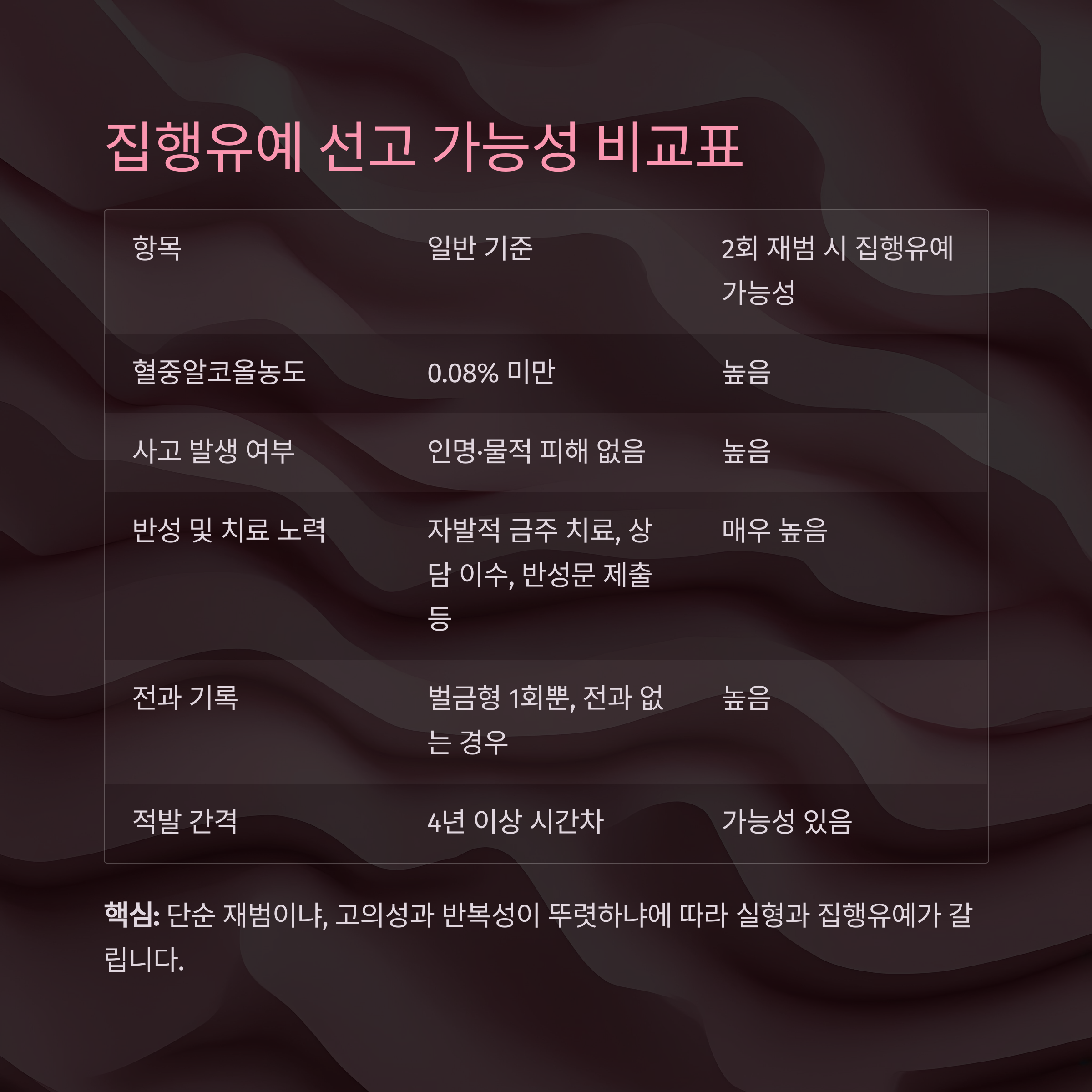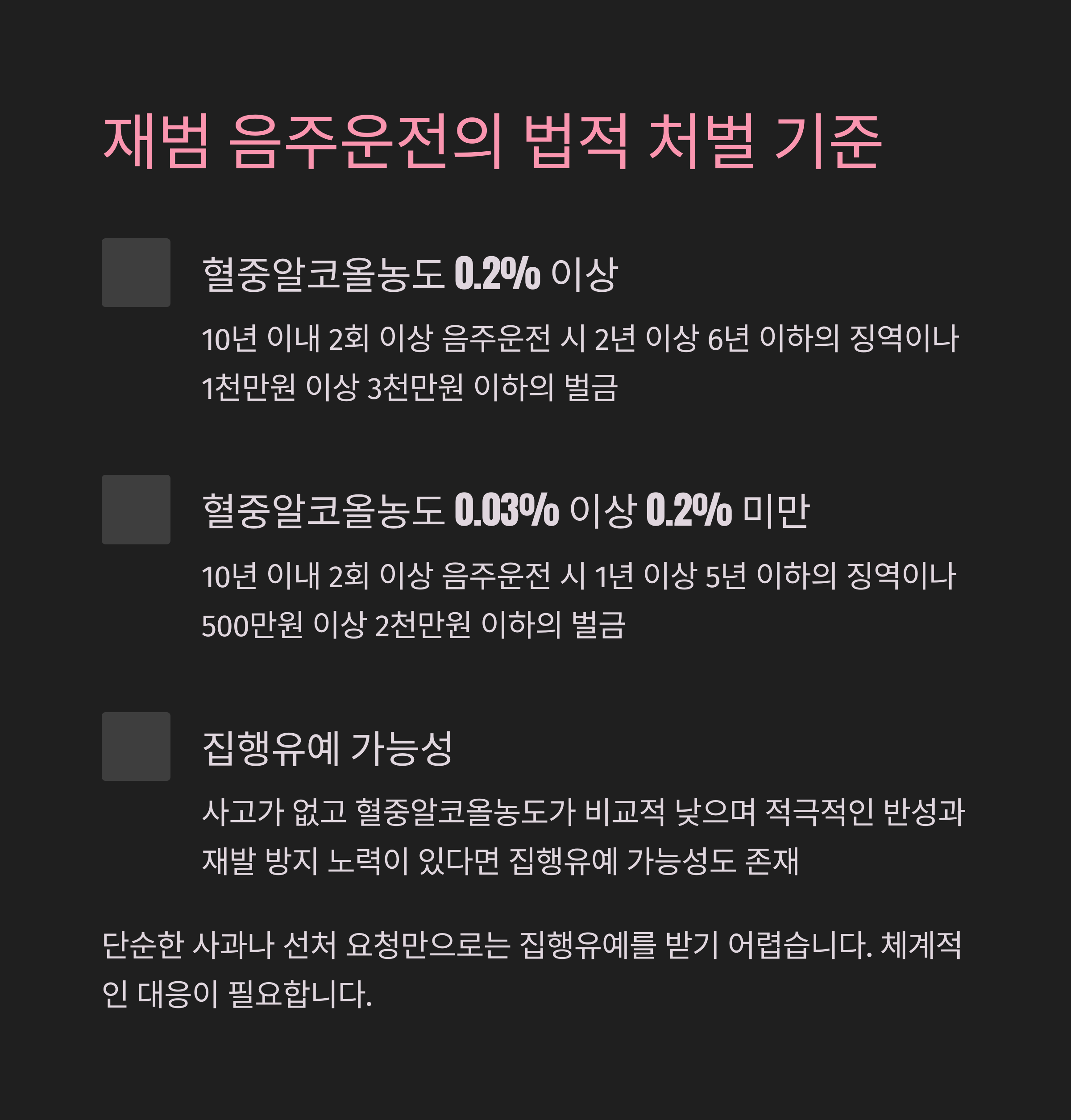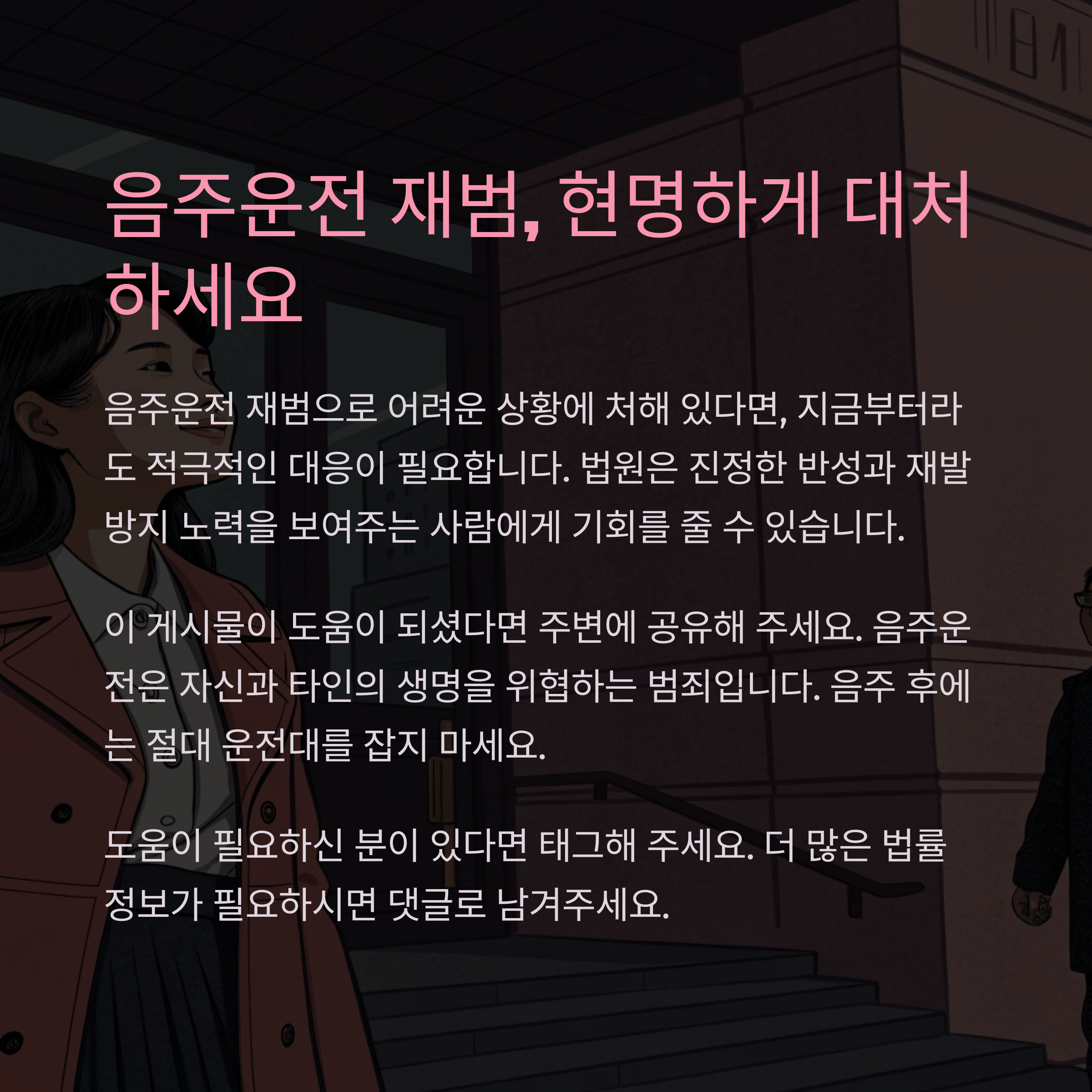 #음주운전재범 #2회적발 #음주운전집행유예 #형사재판전략 #음주운전판례 #반성문작성법 #금주상담치료 #도로교통법148조 #징역형선고기준 #형사처벌대응법