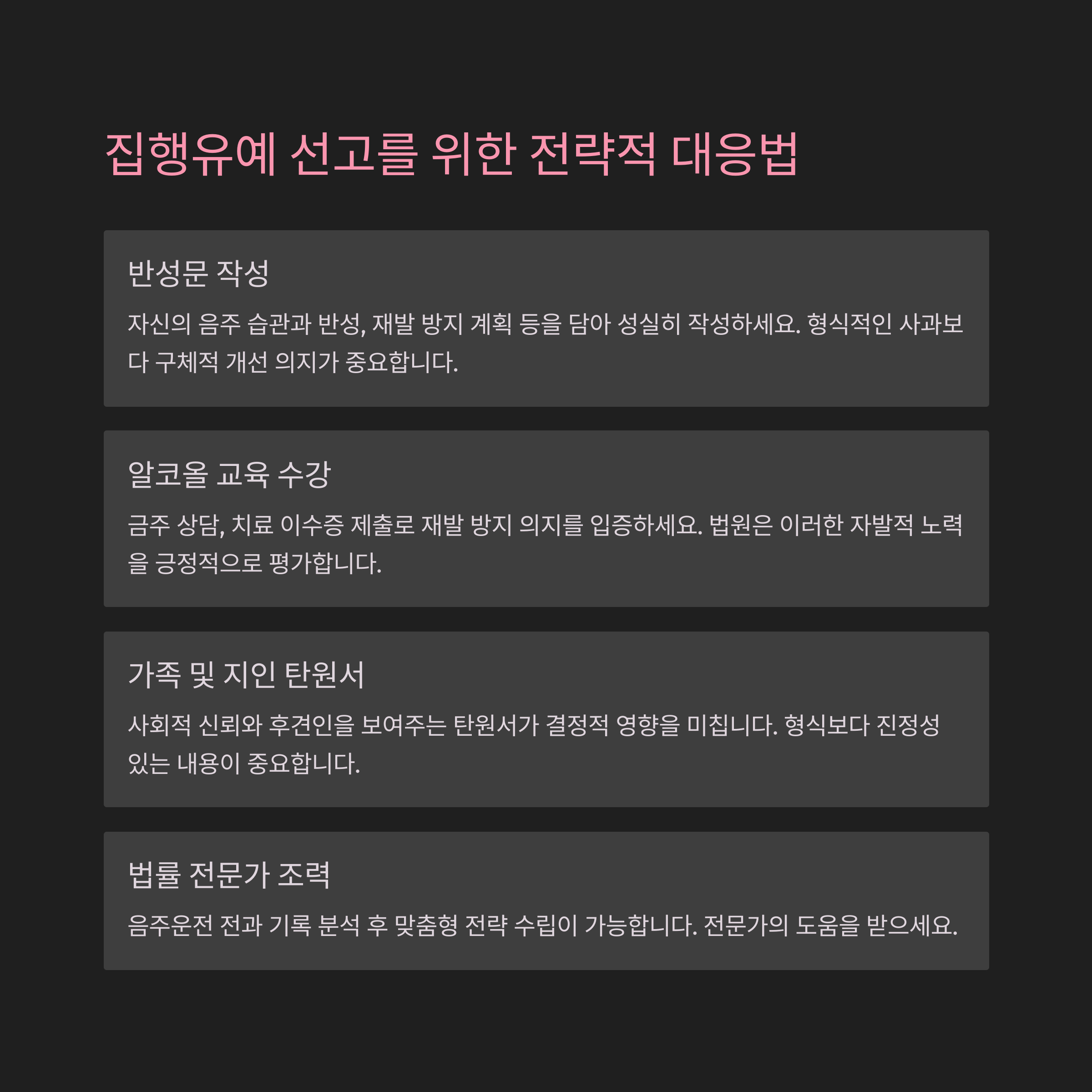 | 반성 및 치료 노력 | 자발적 금주 치료, 상담 이수, 반성문 제출 등 | 매우 높음 |