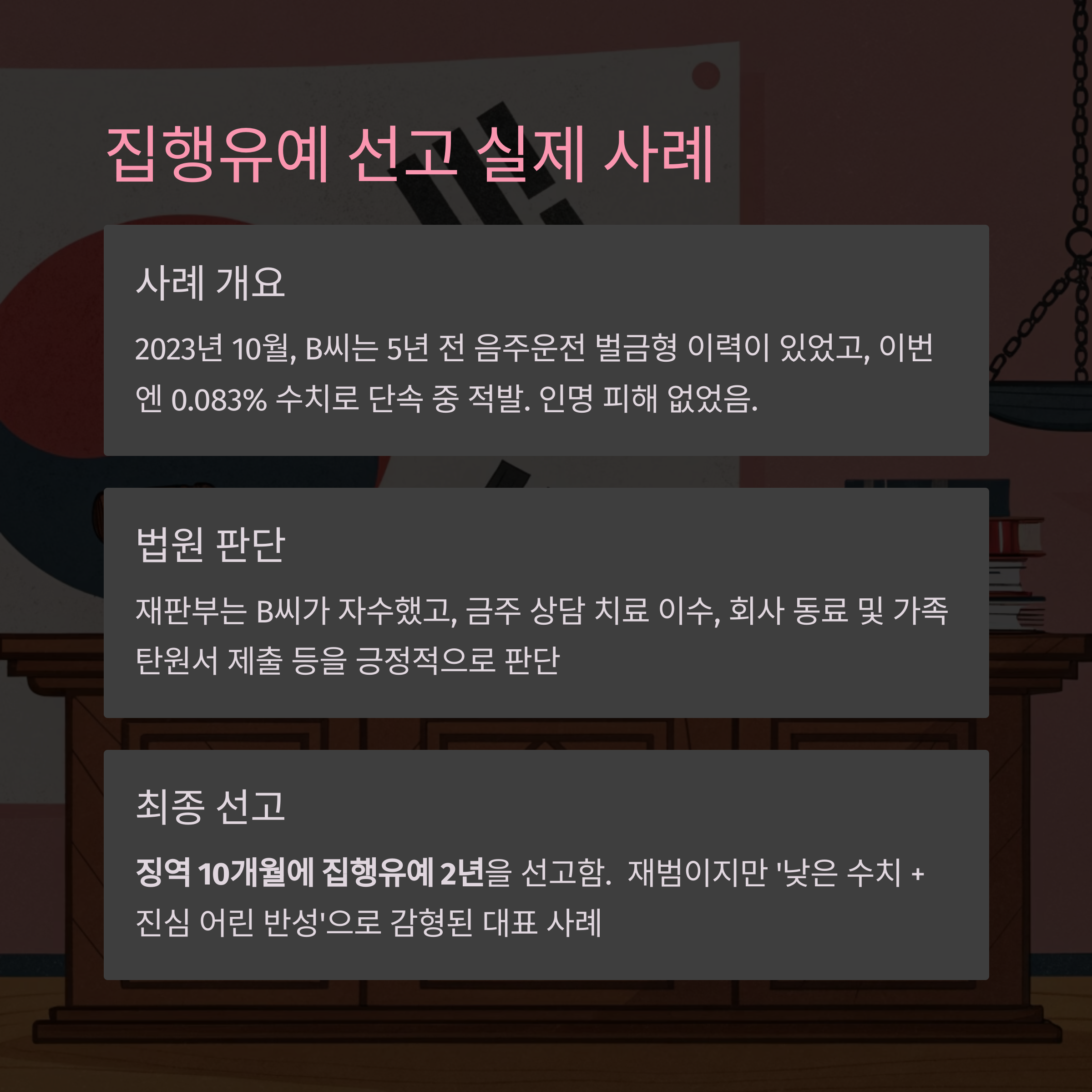 → 사고가 없고, 수치도 낮았다면 집행유예 가능성은 존재합니다.