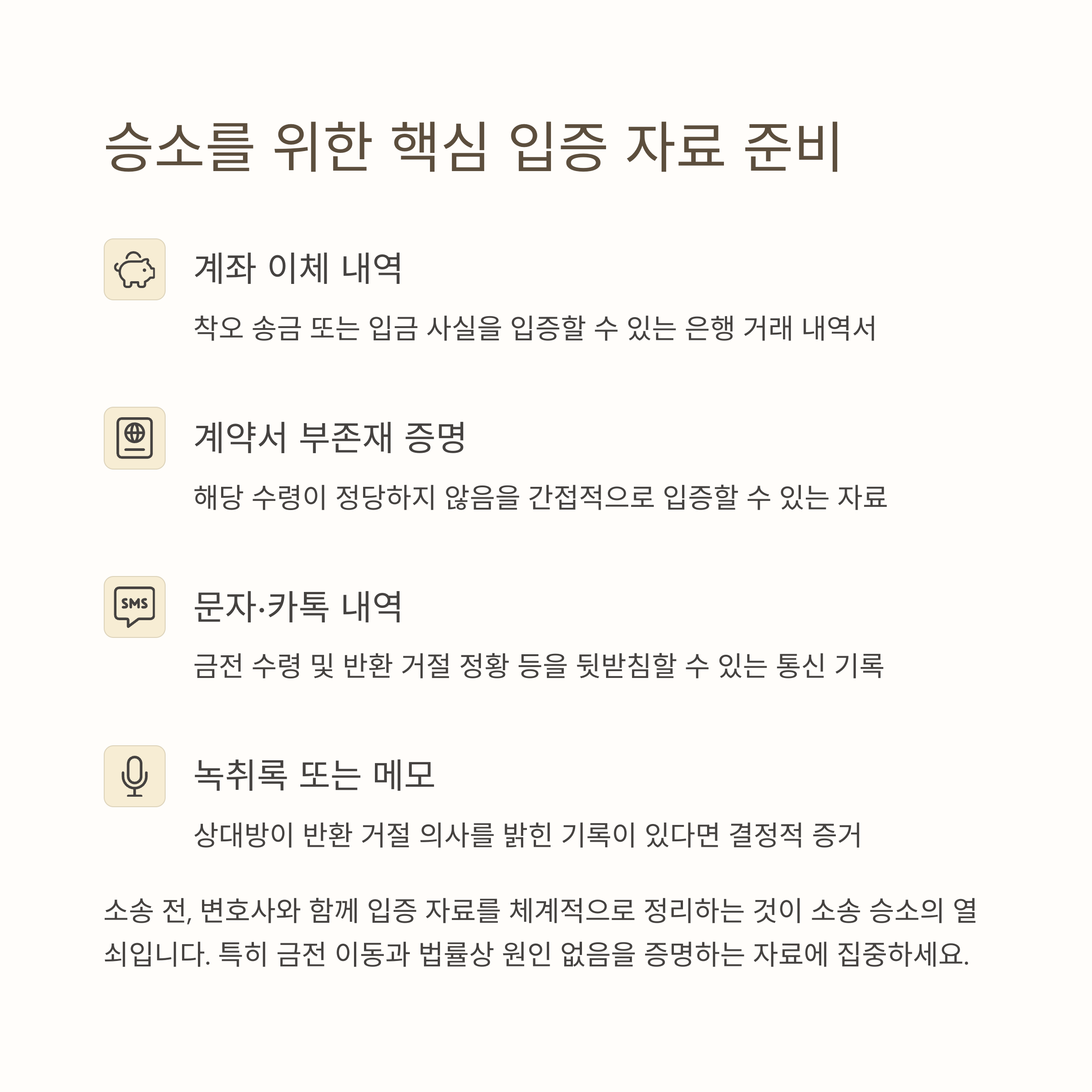 | 녹취록 또는 메모 | 상대방이 반환 거절 의사 밝힌 기록이 있다면 결정적 증거 가능 |