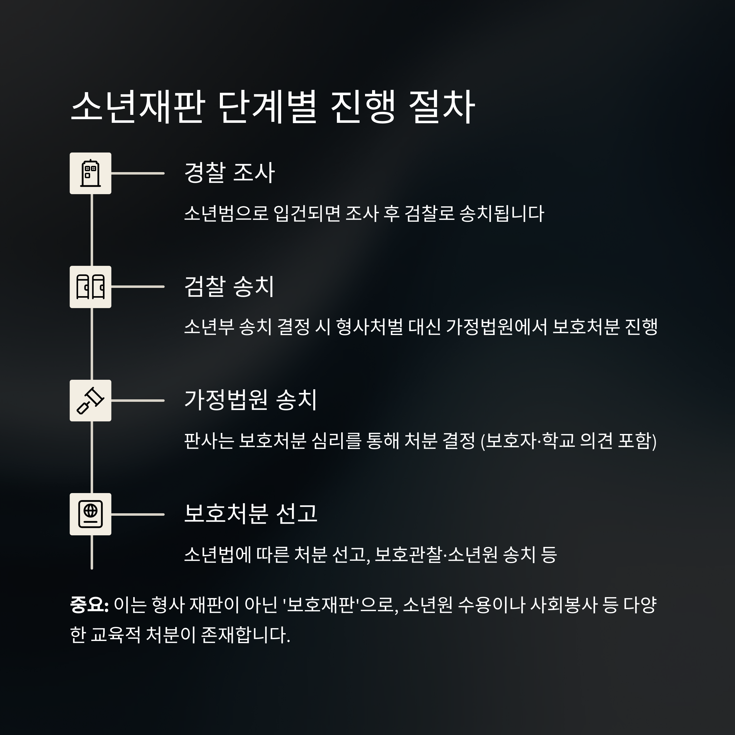 중요: 형사 재판이 아닌 ‘보호재판’이므로, 소년원 수용이나 사회봉사 등 다양한 처분이 존재합니다.