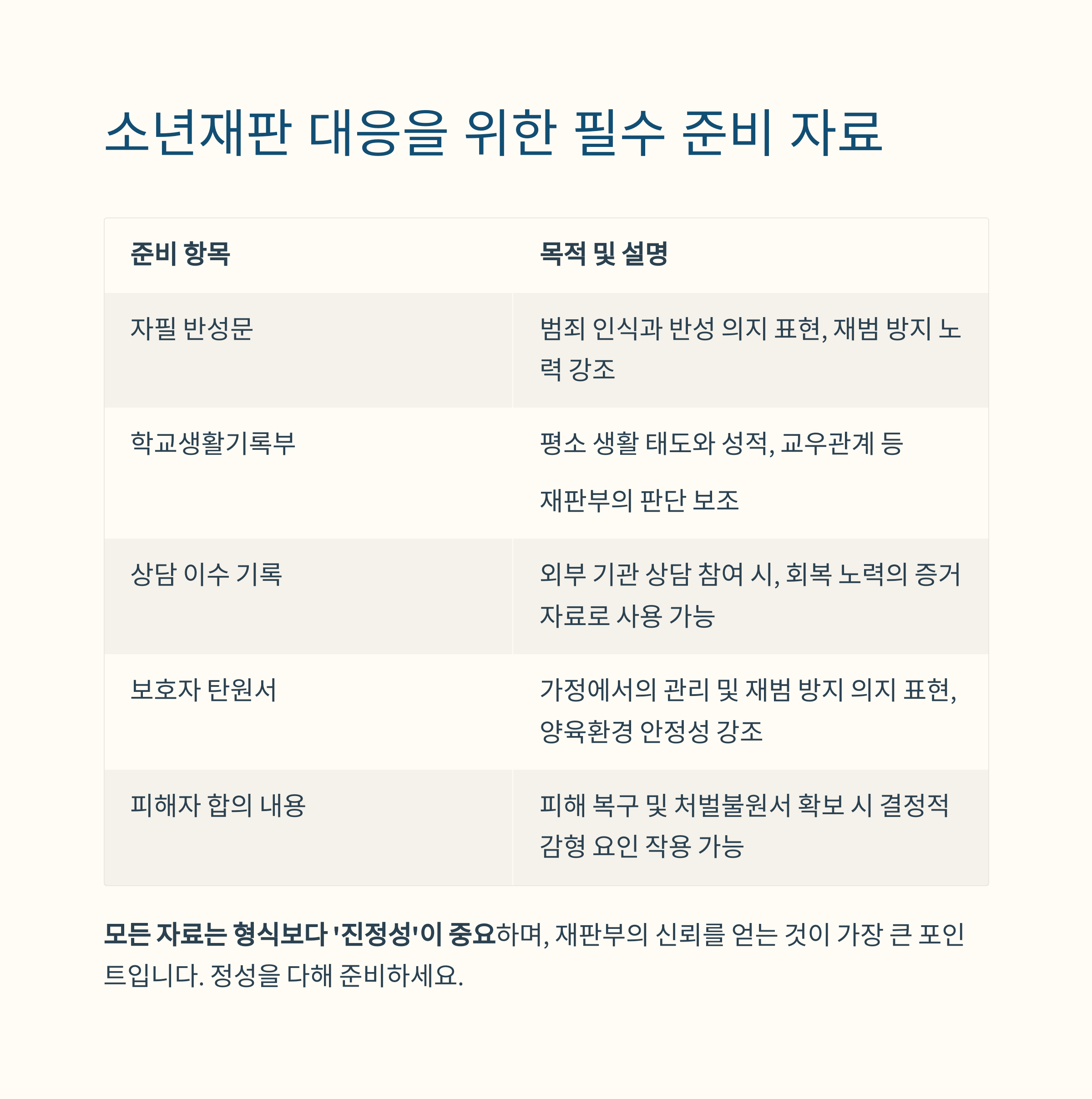 → 초기 진술, 반성문, 학교·가정환경 자료, 상담기록 등이 중요합니다.