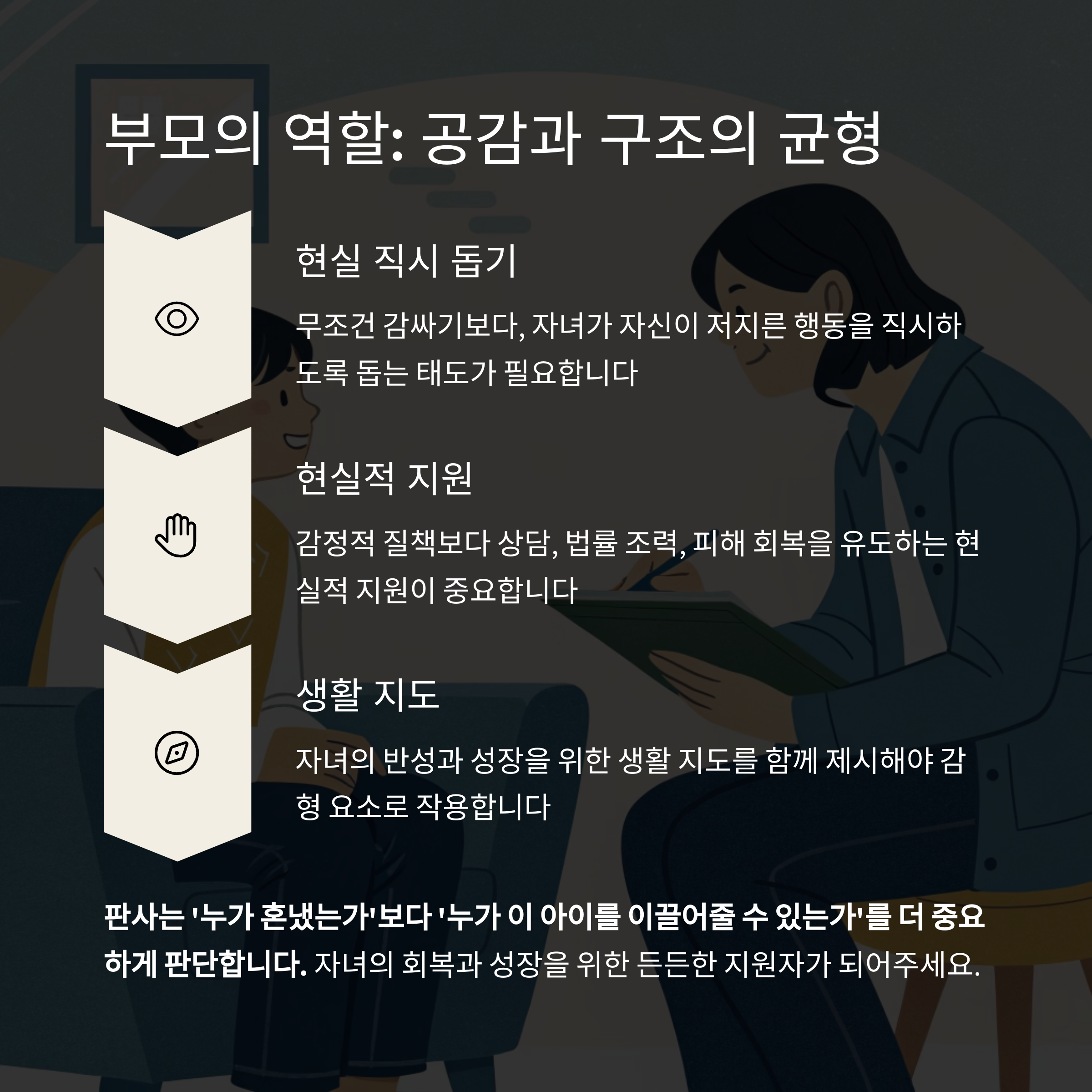 - 무조건 감싸기보다, 자녀가 자신이 저지른 행동을 직시하도록 돕는 태도