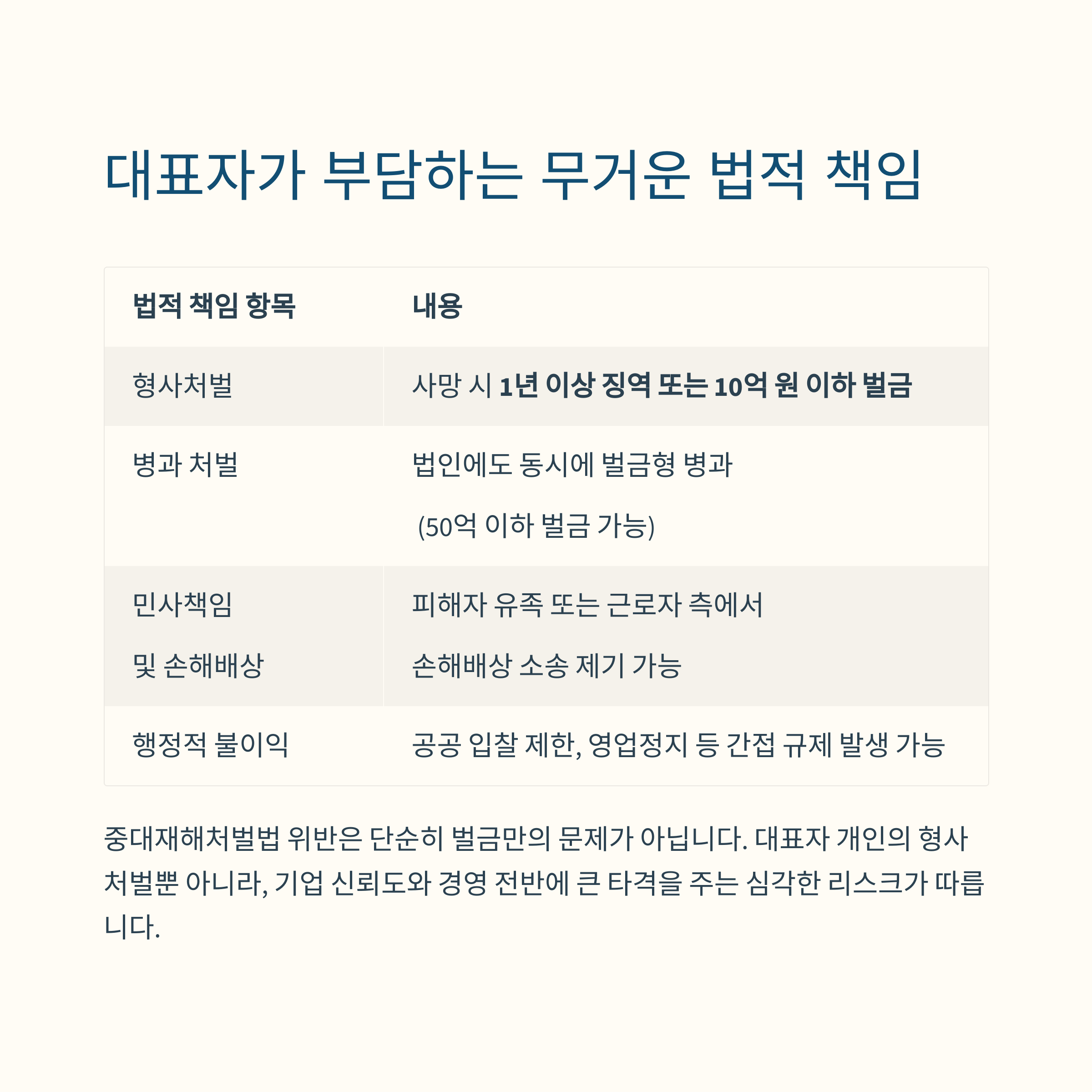 | 사망 사고 발생 | 대표이사 형사처벌 대상 (징역형 또는 벌금형) |
