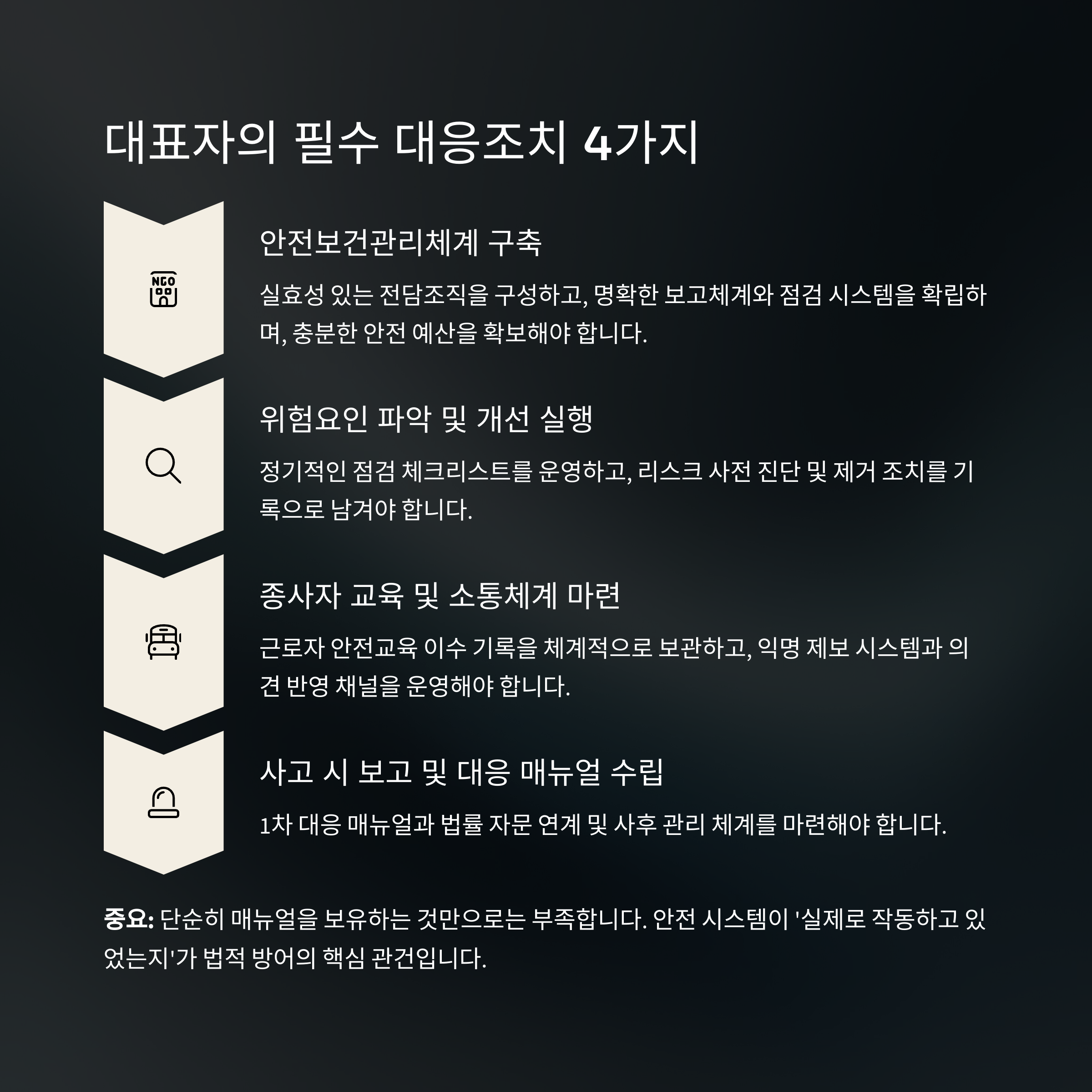 특히 사고가 직접 발생하지 않은 본사 대표라도, 안전관리 체계 구축 책임을 이행하지 않았다면 처벌 대상이 됩니다.