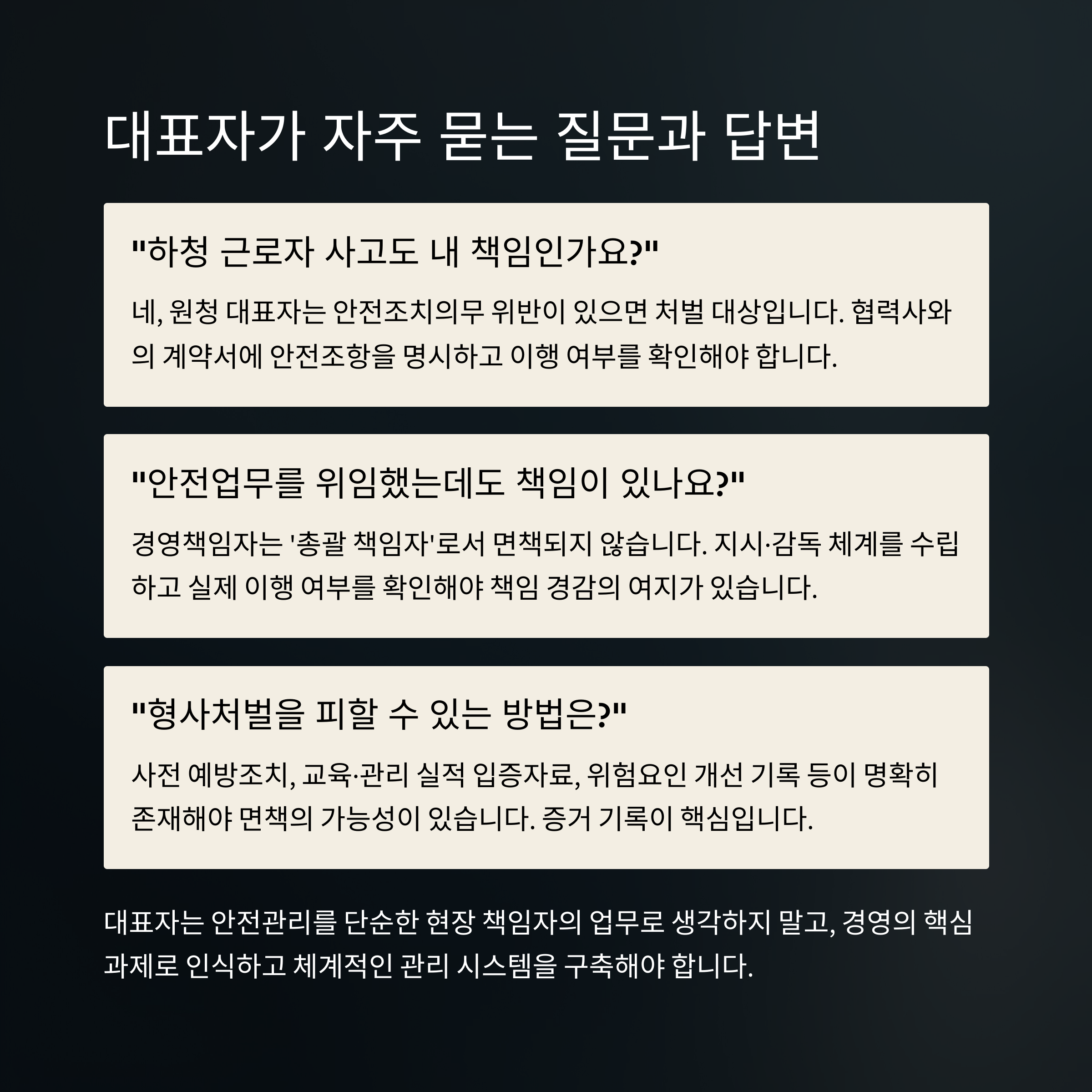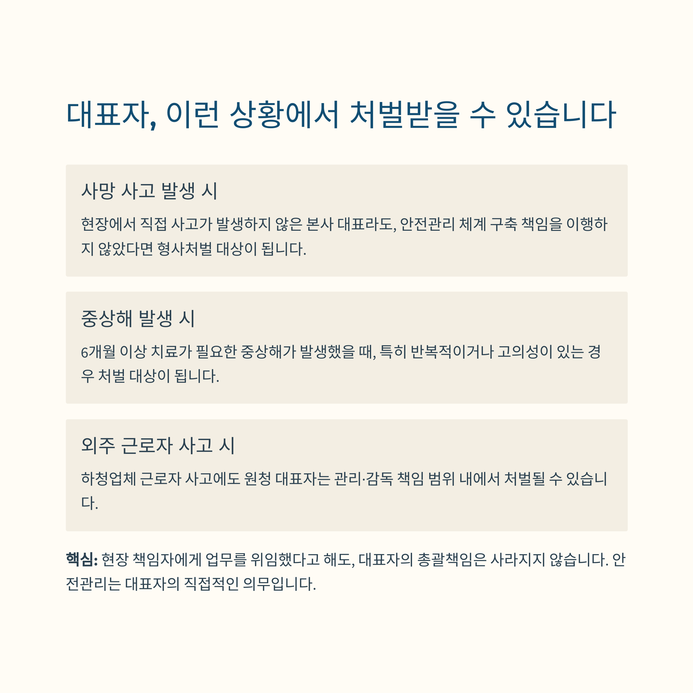 | 외주 근로자 사고 | 원청 대표자도 관리·감독 책임 범위 내에서 처벌될 수 있음 |