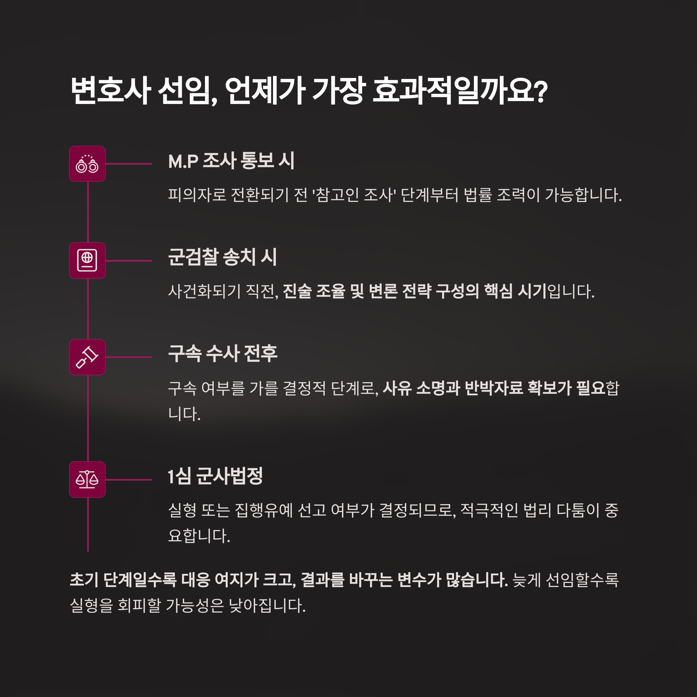 | 군검찰 송치 시 | 사건화되기 직전, 진술 조율 및 변론 전략 구성의 핵심 시기 |