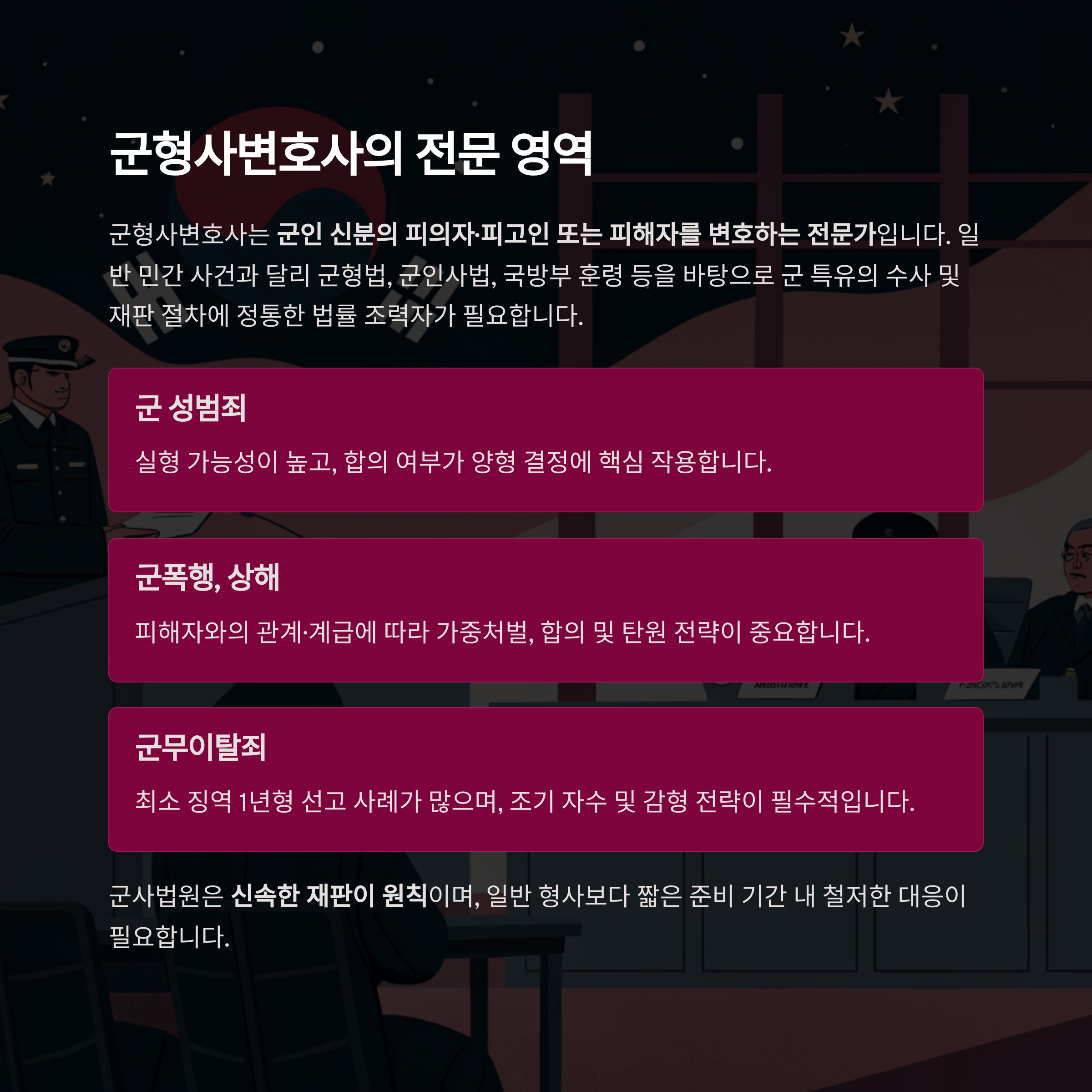 #군형사변호사 #군사법전문 #군검찰대응 #군형사사건 #군재판변호 #군성범죄방어 #군무이탈대응 #군형법전문 #사선변호사필요성 #군징계대응전략