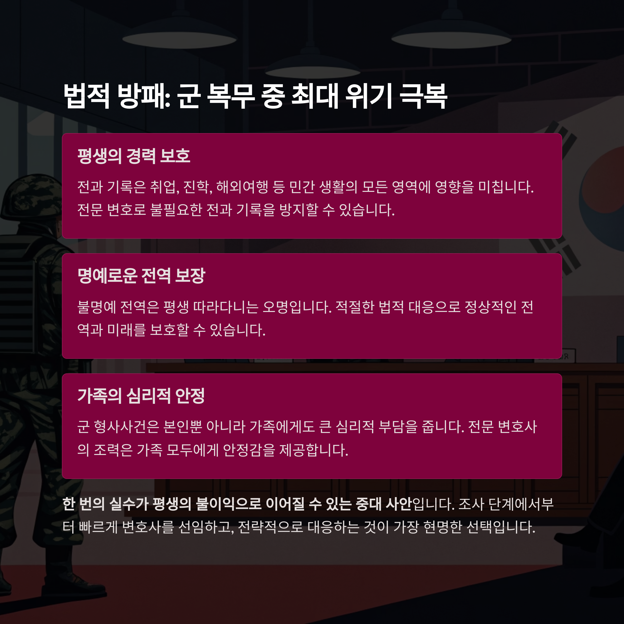 실형 가능성을 줄이고 미래 전역과 사회복귀를 도와주는 역할을 합니다.