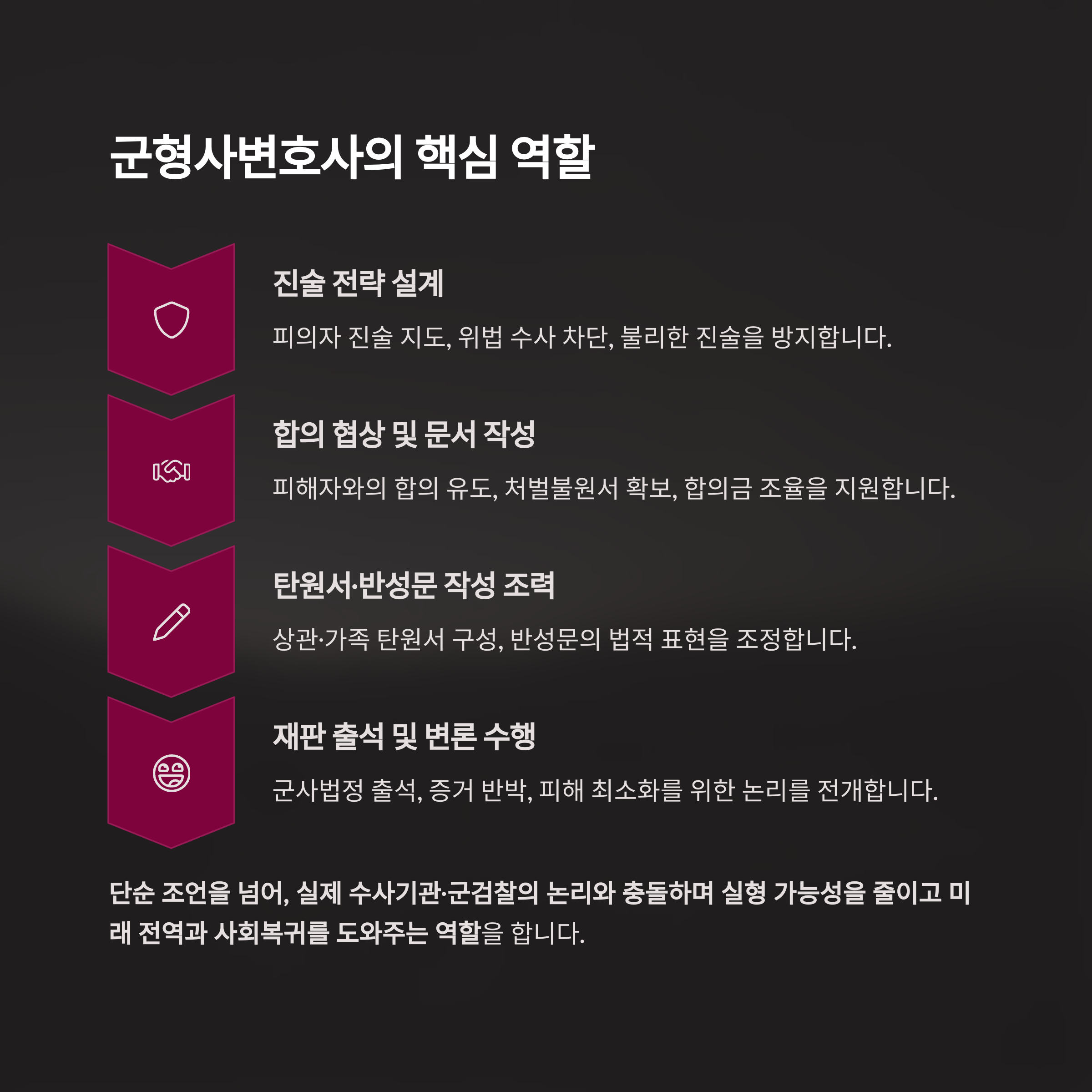 | 군 형사조사 대응 | M.P 조사·군검찰 조사 단계부터 진술 지도, 불이익 진술 방지 역할 수행 |
