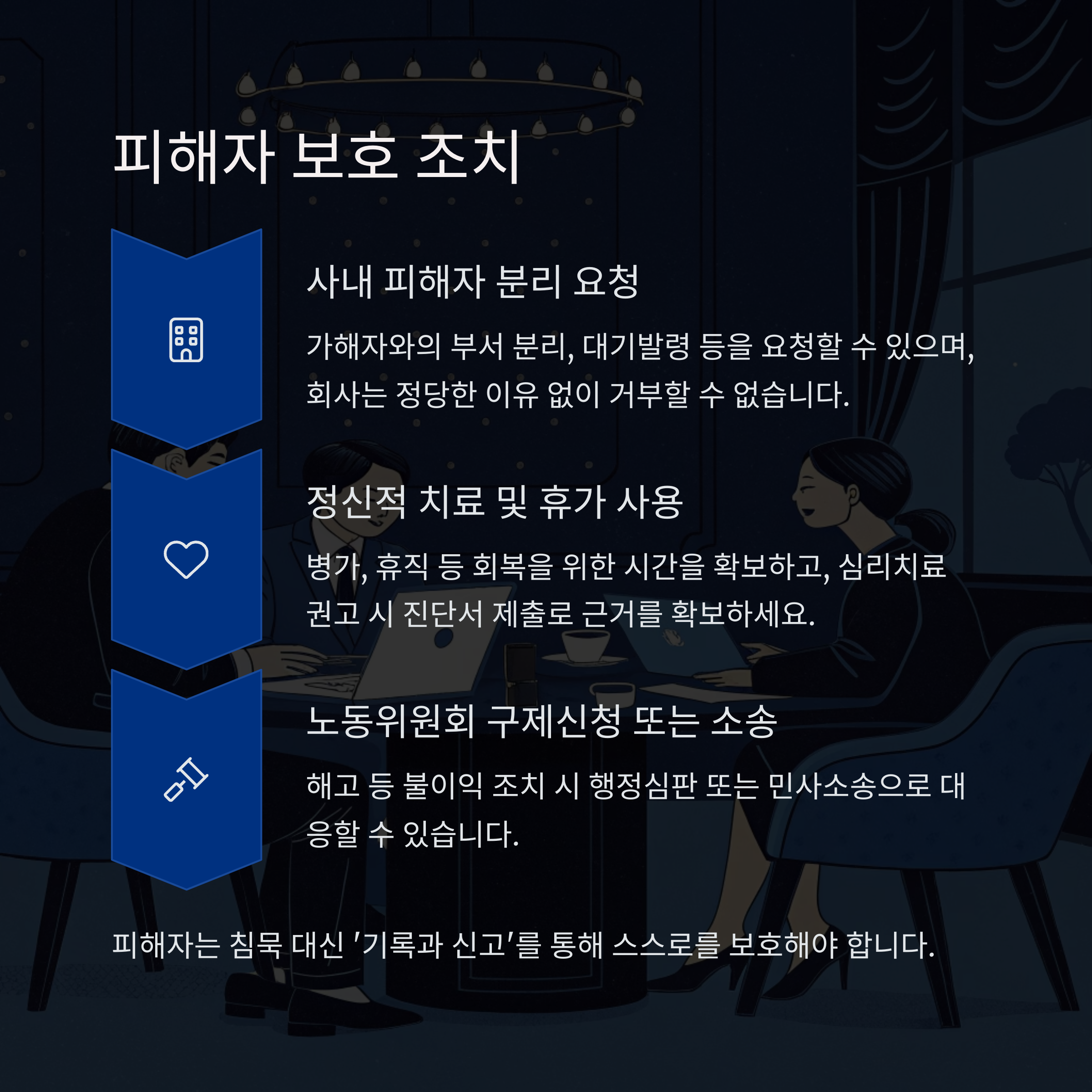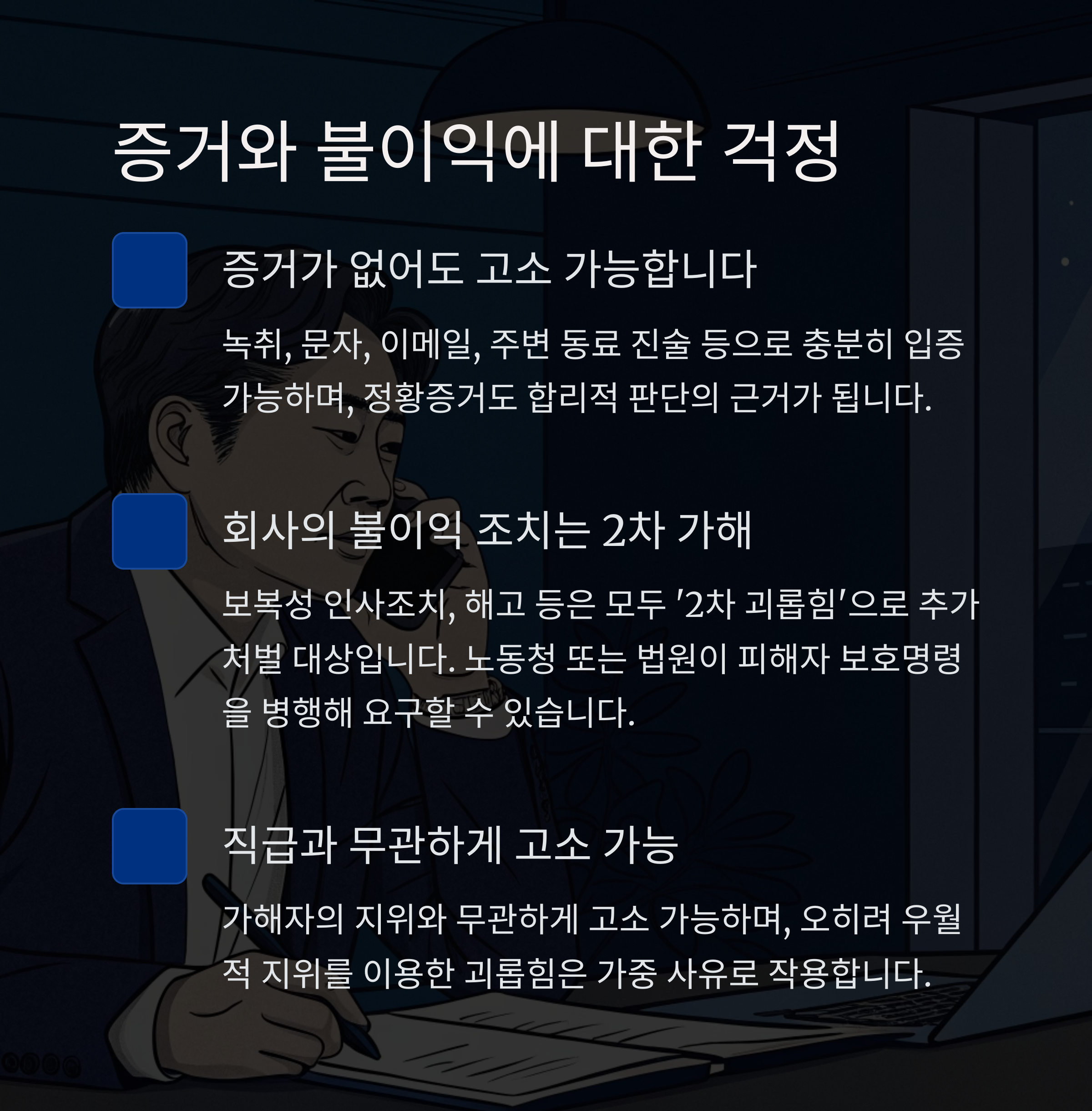 → 보복성 인사조치, 해고 등은 모두 ‘2차 괴롭힘’으로 추가 처벌 대상입니다.