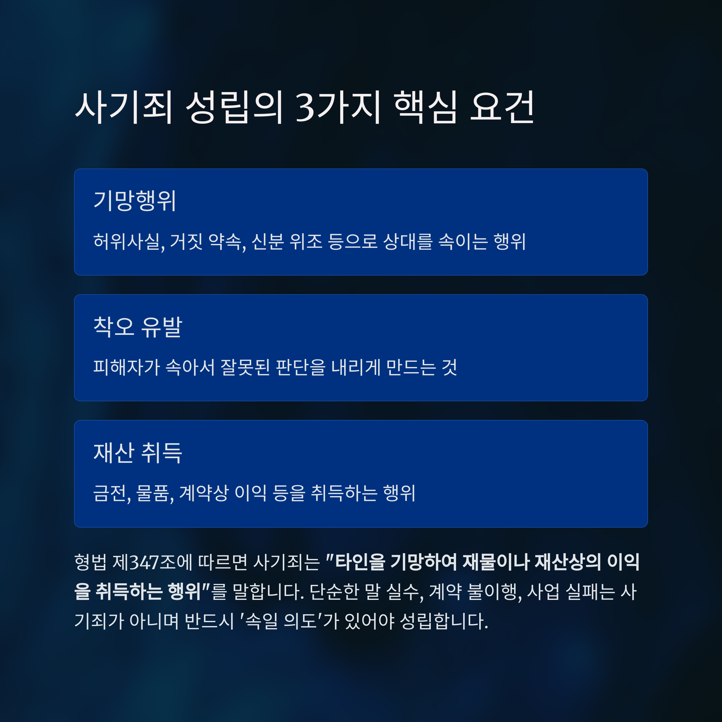 즉, 속일 의도(기망) + 재산취득행위 + 피해 발생이 입증되어야 성립됩니다.