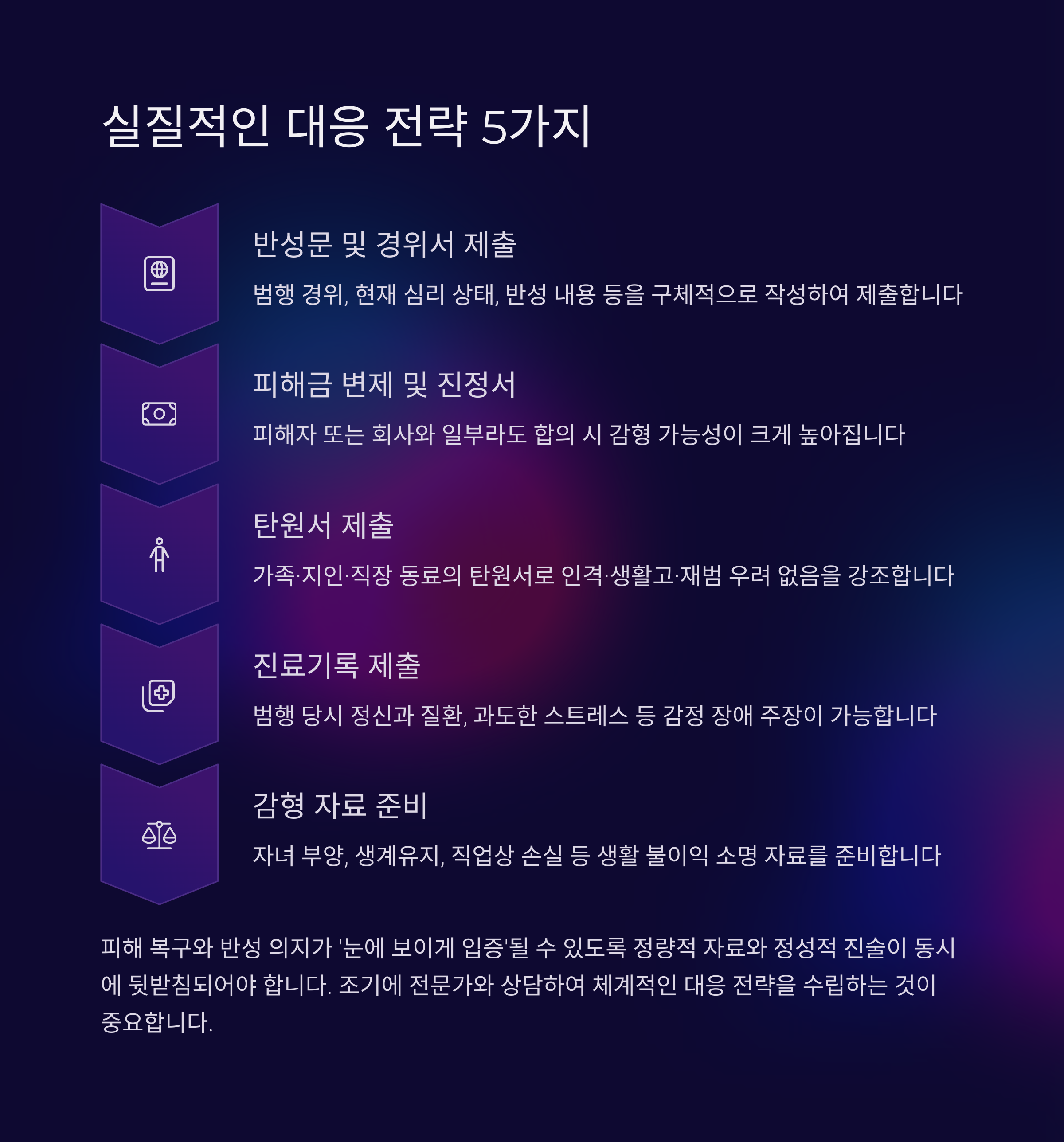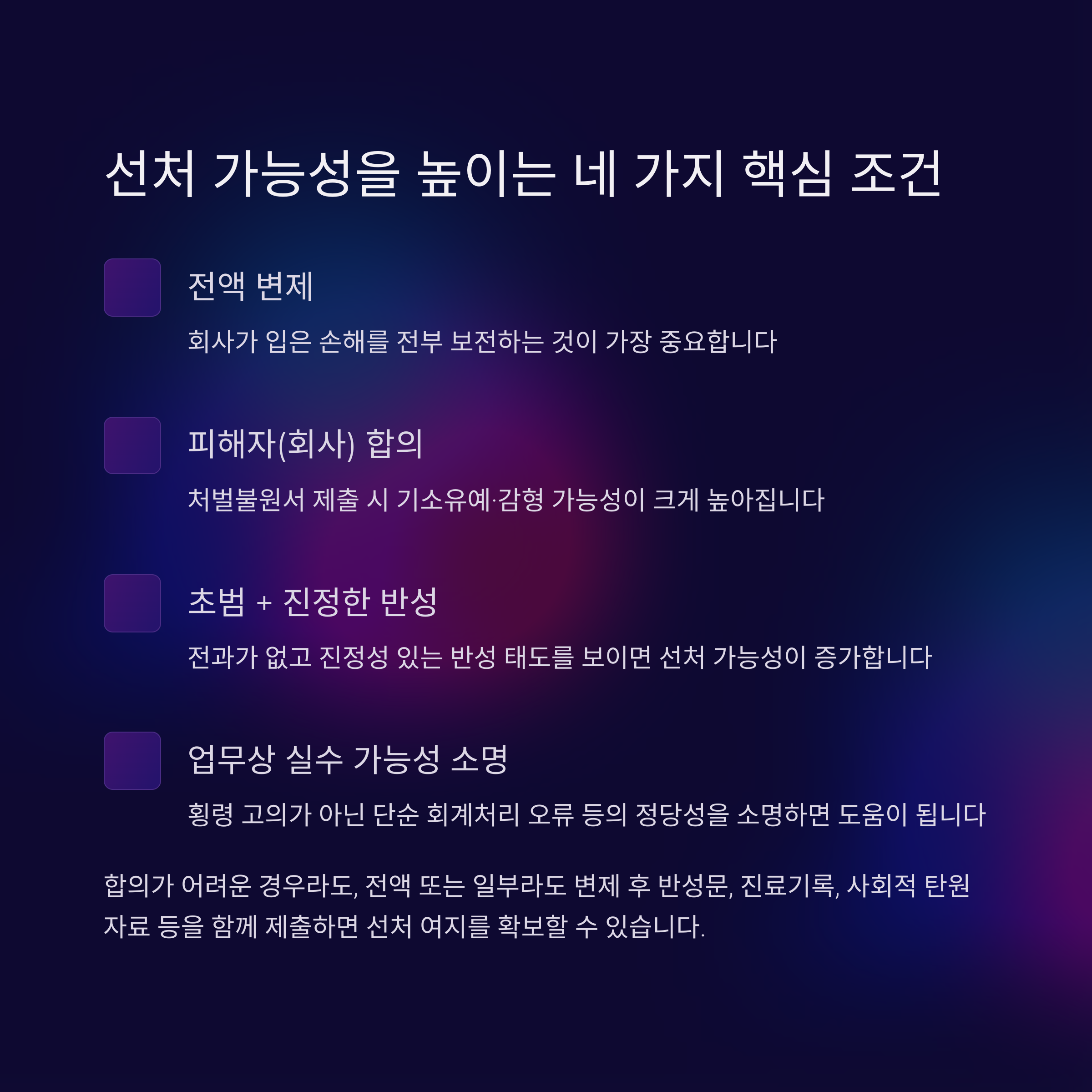 | 피해자(회사) 합의 | 처벌불원서 제출 시 기소유예·감형 가능성 높아짐 |