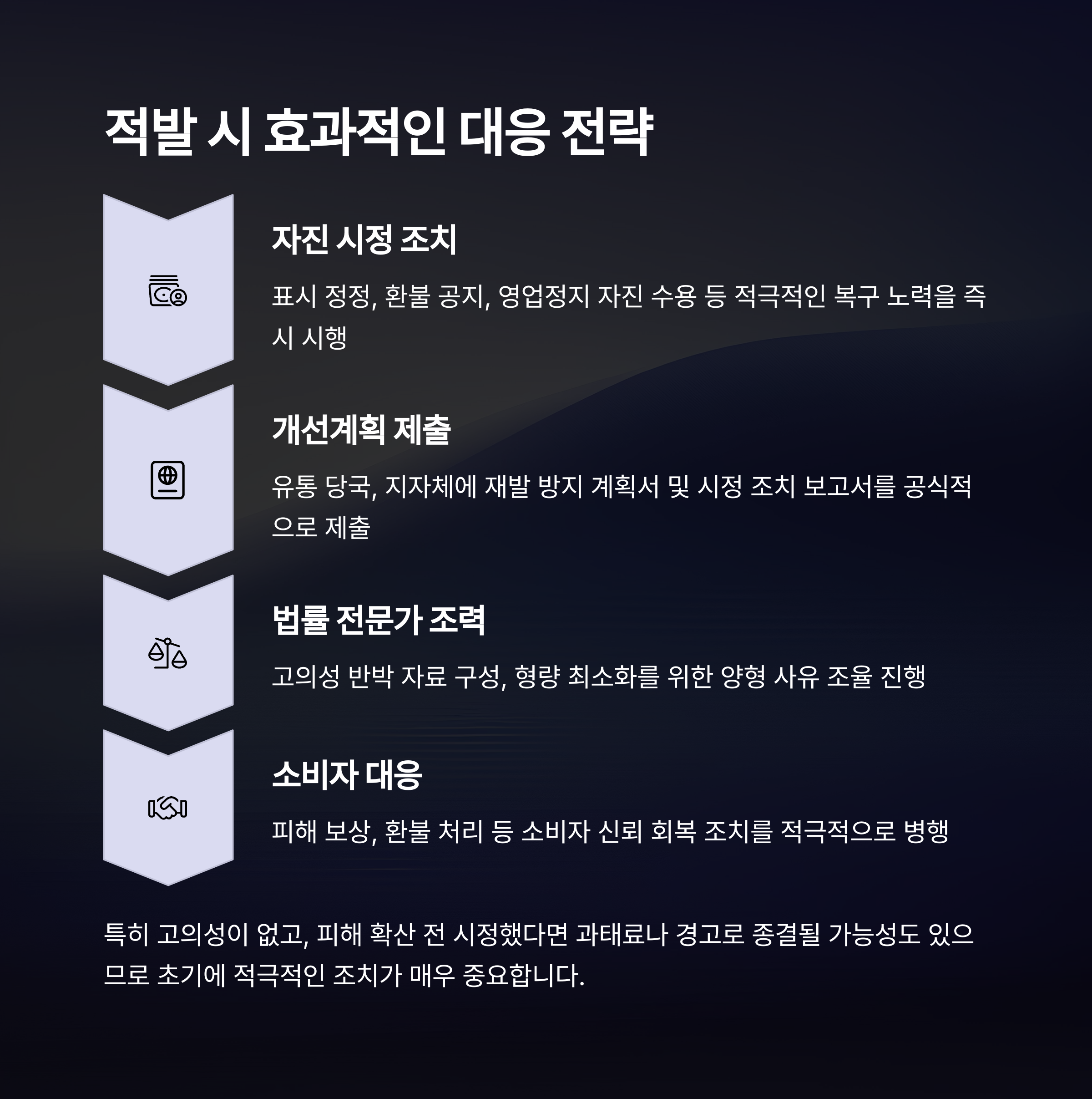 초기 대응과 자진 시정 조치가 핵심 전략이 됩니다.
