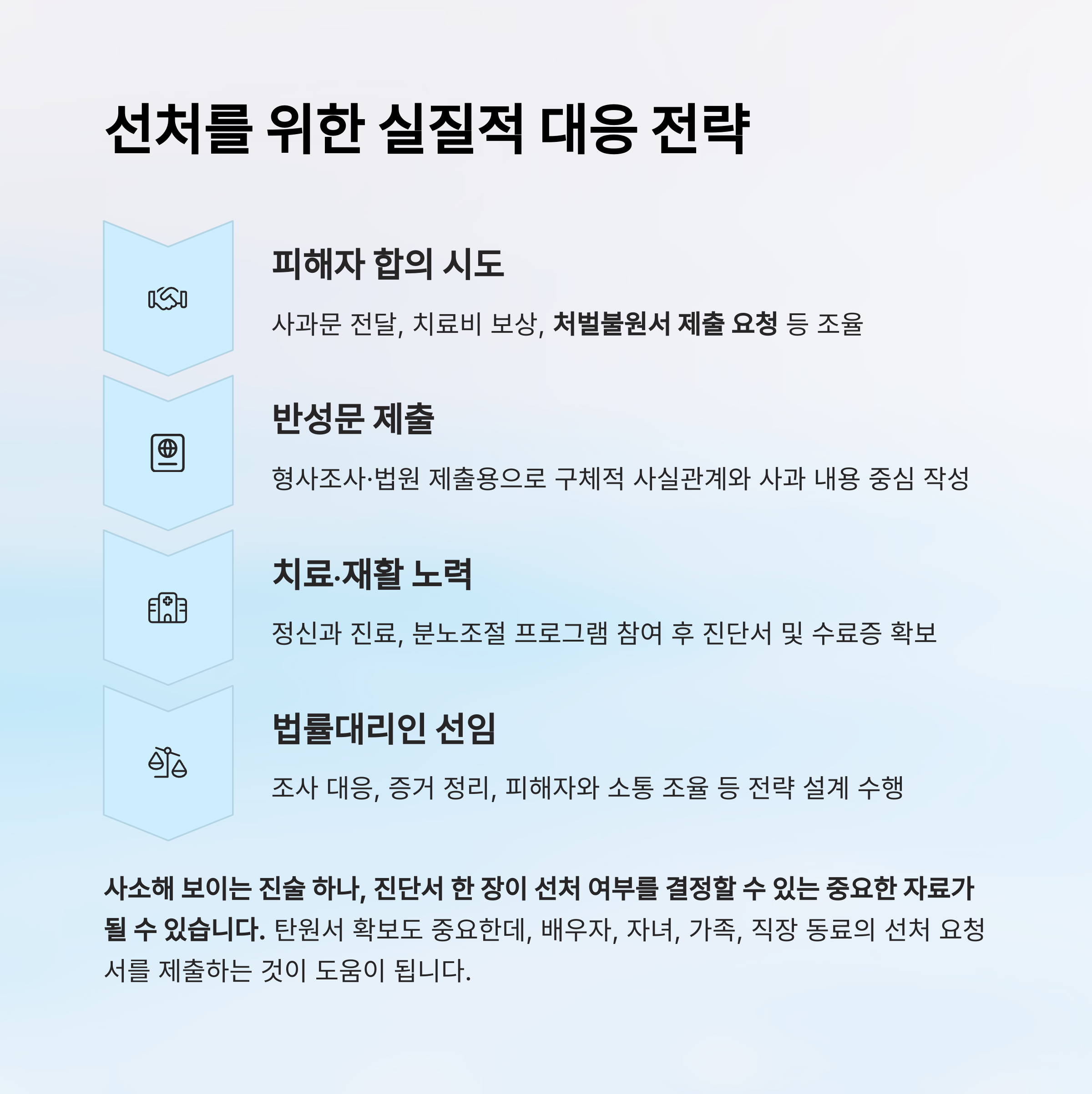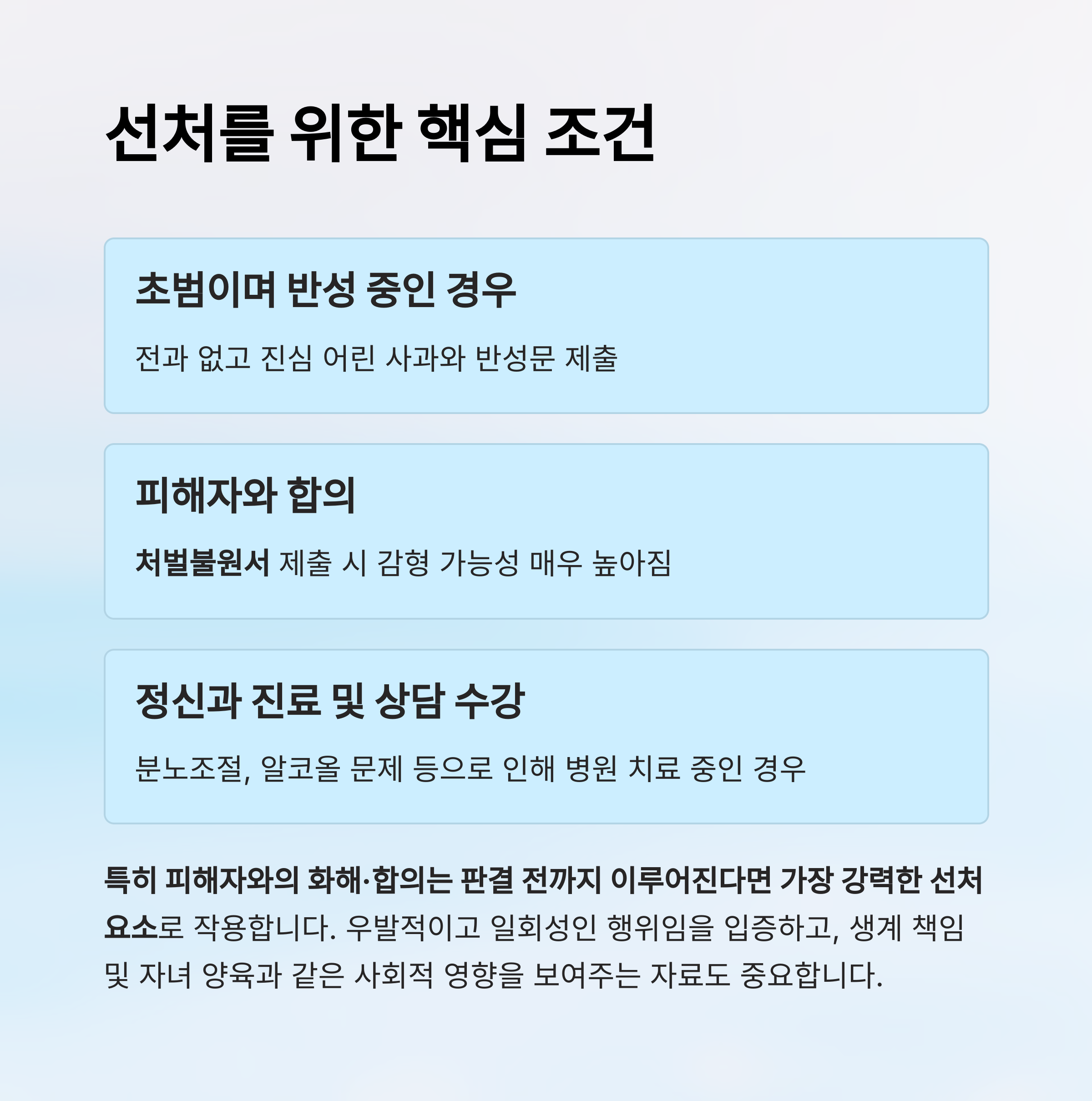 특히 피해자와의 화해·합의는 판결 전까지 이루어진다면 가장 강력한 선처 요소로 작용합니다.