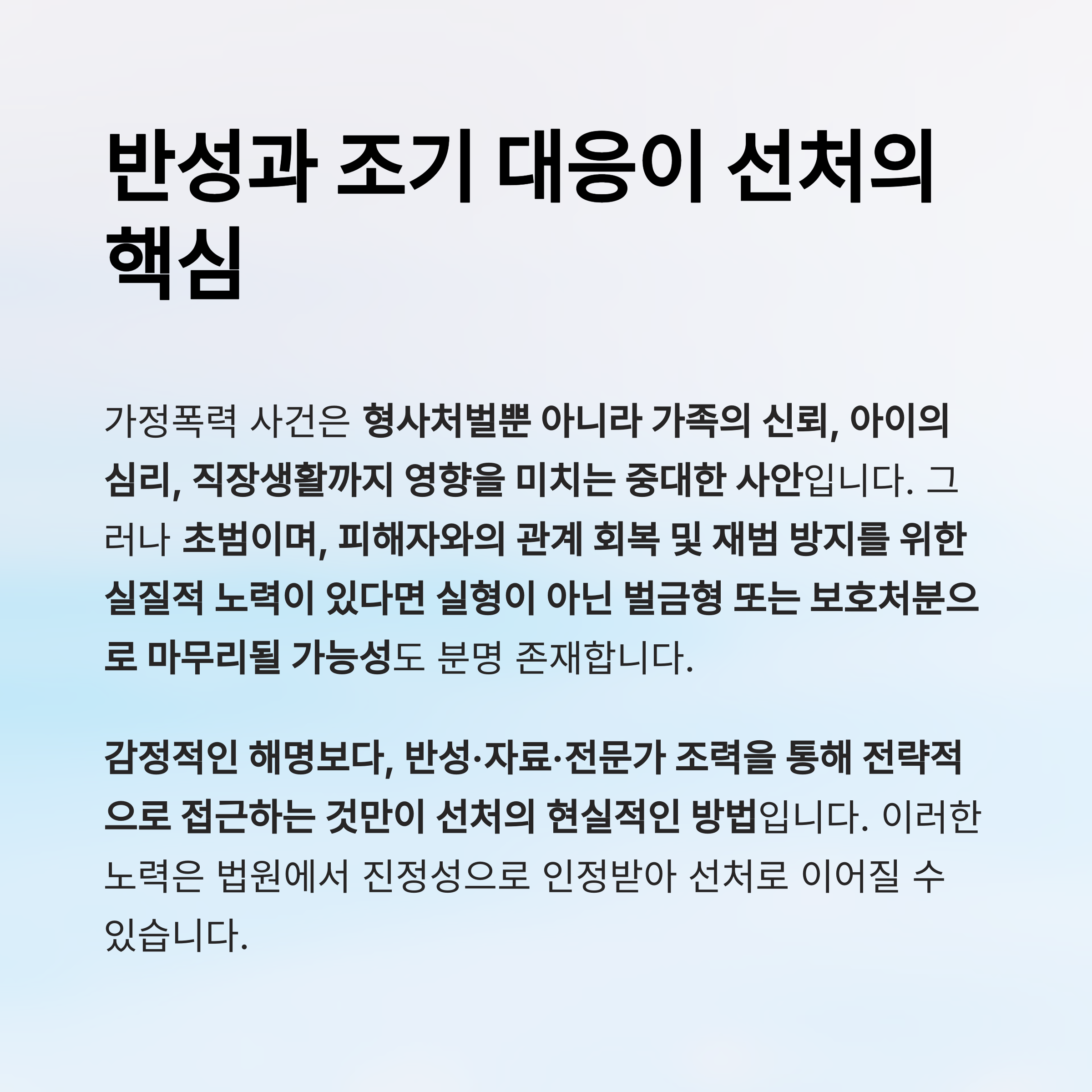 가정폭력 사건은 형사처벌뿐 아니라 가족의 신뢰, 아이의 심리, 직장생활까지 영향을 미치는 중대한 사안입니다.