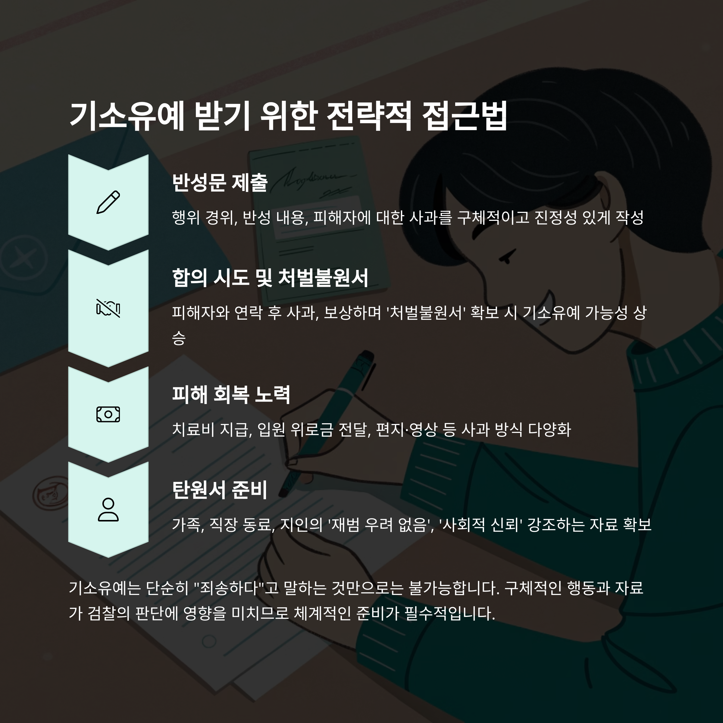 | 합의 시도 및 처벌불원서 | 피해자와 연락 후 사과, 보상하며 ‘처벌불원서’ 확보 시 기소유예 가능성 상승 |